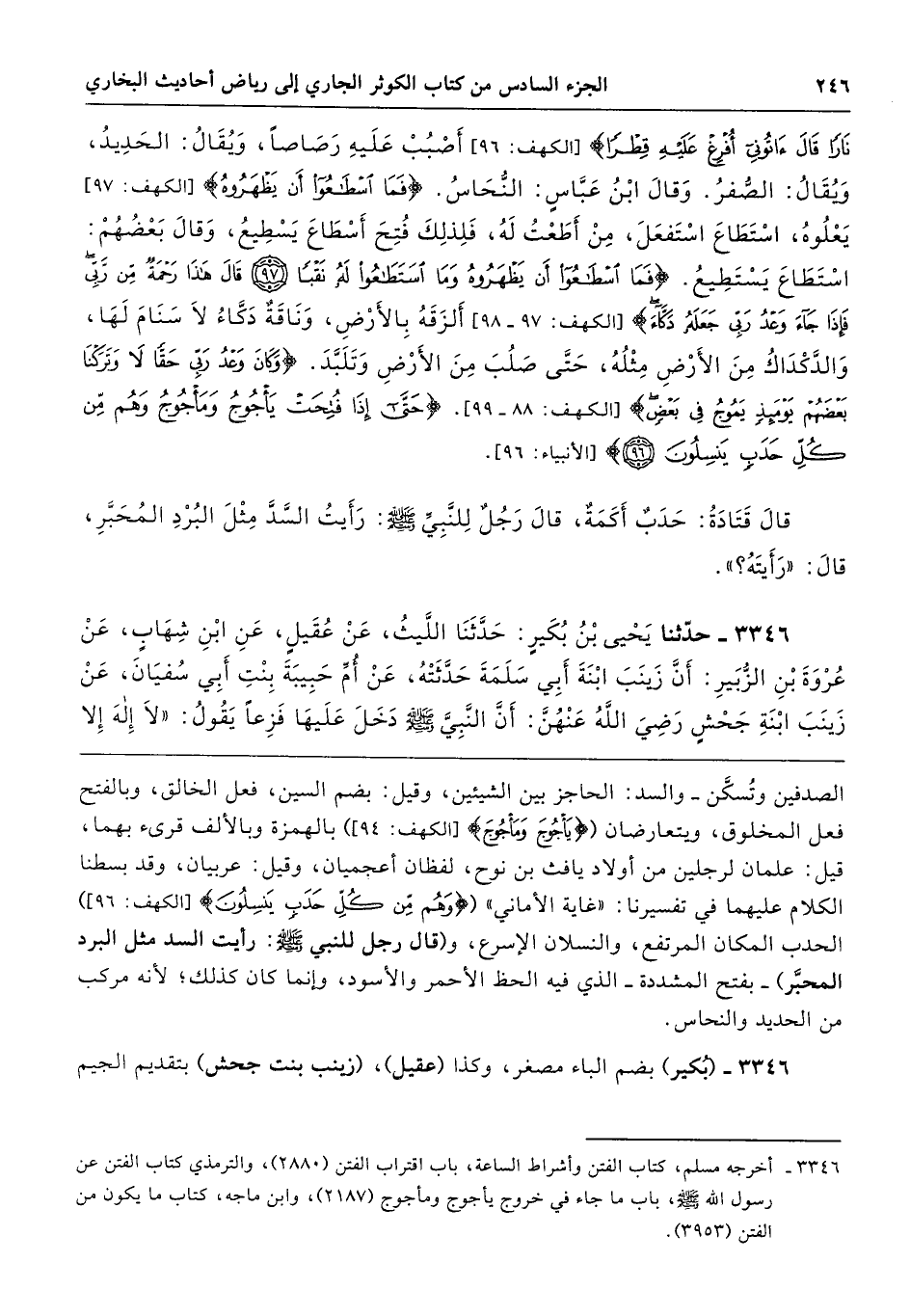 3346 - حَدَّثَنَا يَحْيَى بْنُ بُكَيْرٍ حَدَّثَنَا اللَّيْثُ عَنْ عُقَيْلٍ عَنِ ابْنِ شِهَابٍ عَنْ عُرْوَةَ بْنِ الزُّبَيْرِ أَنَّ زَيْنَبَ ابْنَةَ أَبِى سَلَمَةَ حَدَّثَتْهُ عَنْ أُمِّ حَبِيبَةَ بِنْتِ أَبِى سُفْيَانَ عَنْ زَيْنَبَ ابْنَةِ جَحْشٍ - رضى الله عنهن أَنَّ النَّبِىَّ - صلى الله عليه وسلم - دَخَلَ عَلَيْهَا فَزِعًا يَقُولُ «لاَ إِلَهَ إِلاَّ