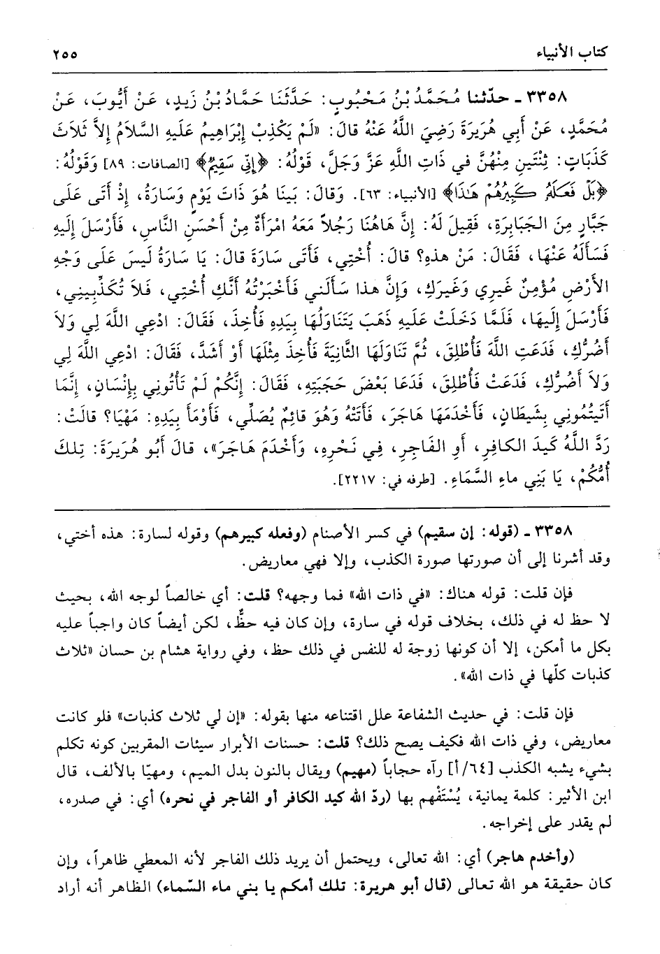 3358 - حَدَّثَنَا مُحَمَّدُ بْنُ مَحْبُوبٍ حَدَّثَنَا حَمَّادُ بْنُ زَيْدٍ عَنْ أَيُّوبَ عَنْ مُحَمَّدٍ عَنْ أَبِى هُرَيْرَةَ - رضى الله عنه - قَالَ لَمْ يَكْذِبْ إِبْرَاهِيمُ - عَلَيْهِ السَّلاَمُ - إِلاَّ ثَلاَثَ كَذَبَاتٍ ثِنْتَيْنِ مِنْهُنَّ فِي ذَاتِ اللَّهِ عَزَّ وَجَلَّ، قَوْلُهُ (إِنِّى سَقِيمٌ) وَقَوْلُهُ (بَلْ فَعَلَهُ كَبِيرُهُمْ هَذَا)، وَقَالَ بَيْنَا هُوَ ذَاتَ يَوْمٍ وَسَارَةُ إِذْ أَتَى عَلَى جَبَّارٍ مِنَ الْجَبَابِرَةِ فَقِيلَ لَهُ إِنَّ هَا هُنَا رَجُلاً مَعَهُ امْرَأَةٌ مِنْ أَحْسَنِ النَّاسِ، فَأَرْسَلَ إِلَيْهِ، فَسَأَلَهُ عَنْهَا. فَقَالَ مَنْ هَذِهِ قَالَ أُخْتِى، فَأَتَى سَارَةَ قَالَ يَا سَارَةُ، لَيْسَ عَلَى وَجْهِ الأَرْضِ مُؤْمِنٌ غَيْرِى وَغَيْرُكِ، وَإِنَّ هَذَا سَأَلَنِى، فَأَخْبَرْتُهُ أَنَّكِ أُخْتِى فَلاَ تُكَذِّبِينِى. فَأَرْسَلَ إِلَيْهَا، فَلَمَّا دَخَلَتْ عَلَيْهِ ذَهَبَ يَتَنَاوَلُهَا بِيَدِهِ، فَأُخِذَ فَقَالَ ادْعِى اللَّهَ لِى وَلاَ أَضُرُّكِ. فَدَعَتِ اللَّهَ فَأُطْلِقَ، ثُمَّ تَنَاوَلَهَا الثَّانِيَةَ، فَأُخِذَ مِثْلَهَا أَوْ أَشَدَّ فَقَالَ ادْعِى اللَّهَ لِى وَلاَ أَضُرُّكِ. فَدَعَتْ فَأُطْلِقَ. فَدَعَا بَعْضَ حَجَبَتِهِ فَقَالَ إِنَّكُمْ لَمْ تَأْتُونِى بِإِنْسَانٍ، إِنَّمَا أَتَيْتُمُونِى بِشَيْطَانٍ. فَأَخْدَمَهَا هَاجَرَ فَأَتَتْهُ، وَهُوَ قَائِمٌ يُصَلِّى، فَأَوْمَأَ بِيَدِهِ مَهْيَا قَالَتْ رَدَّ اللَّهُ كَيْدَ الْكَافِرِ - أَوِ الْفَاجِرِ - فِي نَحْرِهِ، وَأَخْدَمَ هَاجَرَ. قَالَ أَبُو هُرَيْرَةَ تِلْكَ أُمُّكُمْ يَا بَنِى مَاءِ السَّمَاءِ. طرفه 2217