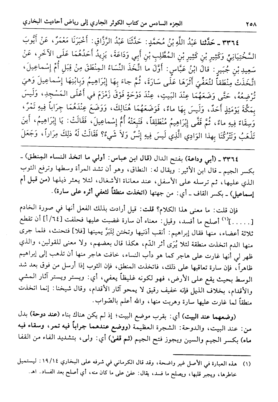 3364 - (أبي وداعة) بفتح الدال (قال ابن عباس: أولي ما اتخذ النساء المِنطق) -بكسر الجيم- قال ابن الأثير: ويقال له: النطاق، وهو أن تشد المرأة وسطها وترفع الثوب الذي عليها، ثم ترسله على الأسفل، عند معاناة الأشغال، لئلا يعثر ذيلها (من قبل أم إسماعيل) -بكسر القاف- أي: من جهتها (اتخذت منطقًا لتعفي أثره على سارة).