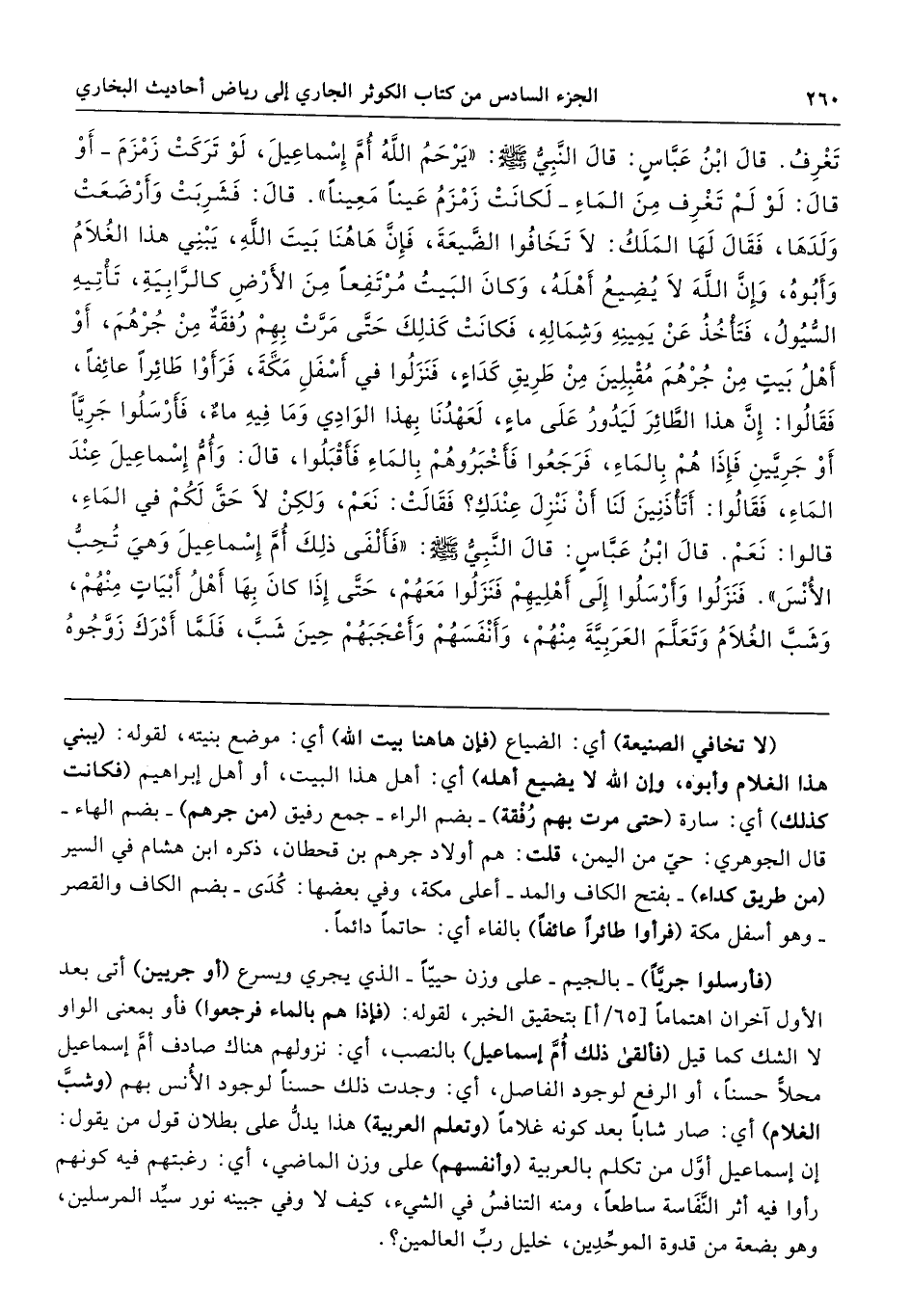 (فأرسلوا جريًّا) -بالجيم- على وزن حييًّا- الذي يجري ويسرع (أو جريين) أتى بعد الأول آخران اهتمامًا بتحقيق الخبر، لقوله: (فإذا هم بالماء فرجعوا) فأو بمعنى الواو لا الشك كما قيل (فألقى ذلك أُمَّ إسماعيل) بالنصب، أي: نزولهم هناك صادف أمَّ إسماعيل محلًّا حسنًا، أو الرفع لوجود الفاصل، أي: وجدت ذلك حسنًا لوجود الأُنس بهم (وشبَّ الغلام) أي: صار شابًّا بعد كونه غلامًا (وتعلم العربية) هذا يدلُّ على بطلان قول من يقول: إن إسماعيل أوَّل من تكلم بالعربية (وأنفسهم) على وزن الماضي، أي: رغبتهم فيه كونهم رأوا فيه أثر النَّفَاسة ساطعًا، ومنه التنافسُ في الشيء، كيف لا وفي جبينه نور سيِّد المرسلين، وهو بضعة من قدوة الموحِّدِين، خليل ربِّ العالمين؟.