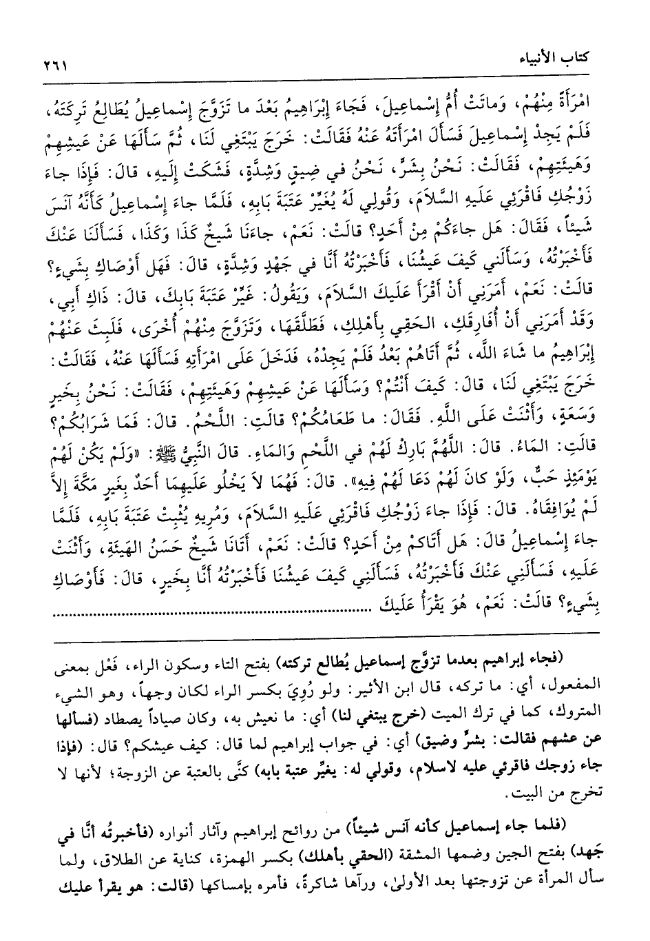امْرَأَةً مِنْهُمْ، وَمَاتَتْ أُمُّ إِسْمَاعِيلَ، فَجَاءَ إِبْرَاهِيمُ، بَعْدَ مَا تَزَوَّجَ إِسْمَاعِيلُ يُطَالِعُ تَرِكَتَهُ، فَلَمْ يَجِدْ إِسْمَاعِيلَ، فَسَأَلَ امْرَأَتَهُ عَنْهُ فَقَالَتْ خَرَجَ يَبْتَغِى لَنَا. ثُمَّ سَأَلَهَا عَنْ عَيْشِهِمْ وَهَيْئَتِهِمْ فَقَالَتْ نَحْنُ بِشَرٍّ، نَحْنُ فِي ضِيقٍ وَشِدَّةٍ. فَشَكَتْ إِلَيْهِ. قَالَ فَإِذَا جَاءَ زَوْجُكِ فَاقْرَئِى عَلَيْهِ السَّلاَمَ، وَقُولِى لَهُ يُغَيِّرْ عَتَبَةَ بَابِهِ. فَلَمَّا جَاءَ إِسْمَاعِيلُ، كَأَنَّهُ آنَسَ شَيْئًا، فَقَالَ هَلْ جَاءَكُمْ مِنْ أَحَدٍ قَالَتْ نَعَمْ، جَاءَنَا شَيْخٌ كَذَا وَكَذَا، فَسَأَلَنَا عَنْكَ فَأَخْبَرْتُهُ، وَسَأَلَنِى كَيْفَ عَيْشُنَا فَأَخْبَرْتُهُ أَنَّا فِي جَهْدٍ وَشِدَّةٍ. قَالَ فَهَلْ أَوْصَاكِ بِشَىْءٍ قَالَتْ نَعَمْ، أَمَرَنِى أَنْ أَقْرَأَ عَلَيْكَ السَّلاَمَ، وَيَقُولُ غَيِّرْ عَتَبَةَ بَابِكَ. قَالَ ذَاكِ أَبِى وَقَدْ أَمَرَنِى أَنْ أُفَارِقَكِ الْحَقِى بِأَهْلِكِ. فَطَلَّقَهَا، وَتَزَوَّجَ مِنْهُمْ أُخْرَى، فَلَبِثَ عَنْهُمْ إِبْرَاهِيمُ مَا شَاءَ اللَّهُ ثُمَّ أَتَاهُمْ بَعْدُ، فَلَمْ يَجِدْهُ، فَدَخَلَ عَلَى امْرَأَتِهِ، فَسَأَلَهَا عَنْهُ. فَقَالَتْ خَرَجَ يَبْتَغِى لَنَا. قَالَ كَيْفَ أَنْتُمْ وَسَأَلَهَا عَنْ عَيْشِهِمْ، وَهَيْئَتِهِمْ. فَقَالَتْ نَحْنُ بِخَيْرٍ وَسَعَةٍ. وَأَثْنَتْ عَلَى اللَّهِ. فَقَالَ مَا طَعَامُكُمْ قَالَتِ اللَّحْمُ. قَالَ فَمَا شَرَابُكُمْ قَالَتِ الْمَاءُ. فَقَالَ اللَّهُمَّ بَارِكْ لَهُمْ فِي اللَّحْمِ وَالْمَاءِ. قَالَ النَّبِىُّ - صلى الله عليه وسلم - «وَلَمْ يَكُنْ لَهُمْ يَوْمَئِذٍ حَبٌّ، وَلَوْ كَانَ لَهُمْ دَعَا لَهُمْ فِيهِ». قَالَ فَهُمَا لاَ يَخْلُو عَلَيْهِمَا أَحَدٌ بِغَيْرِ مَكَّةَ إِلاَّ لَمْ يُوَافِقَاهُ. قَالَ فَإِذَا جَاءَ زَوْجُكِ فَاقْرَئِى عَلَيْهِ السَّلاَمَ، وَمُرِيهِ يُثْبِتُ عَتَبَةَ بَابِهِ، فَلَمَّا جَاءَ إِسْمَاعِيلُ قَالَ هَلْ أَتَاكُمْ مِنْ أَحَدٍ قَالَتْ نَعَمْ أَتَانَا شَيْخٌ حَسَنُ الْهَيْئَةِ، وَأَثْنَتْ عَلَيْهِ، فَسَأَلَنِى عَنْكَ فَأَخْبَرْتُهُ، فَسَأَلَنِى كَيْفَ عَيْشُنَا فَأَخْبَرْتُهُ أَنَّا بِخَيْرٍ. قَالَ فَأَوْصَاكِ بِشَىْءٍ قَالَتْ نَعَمْ، هُوَ يَقْرَأُ عَلَيْكَ
