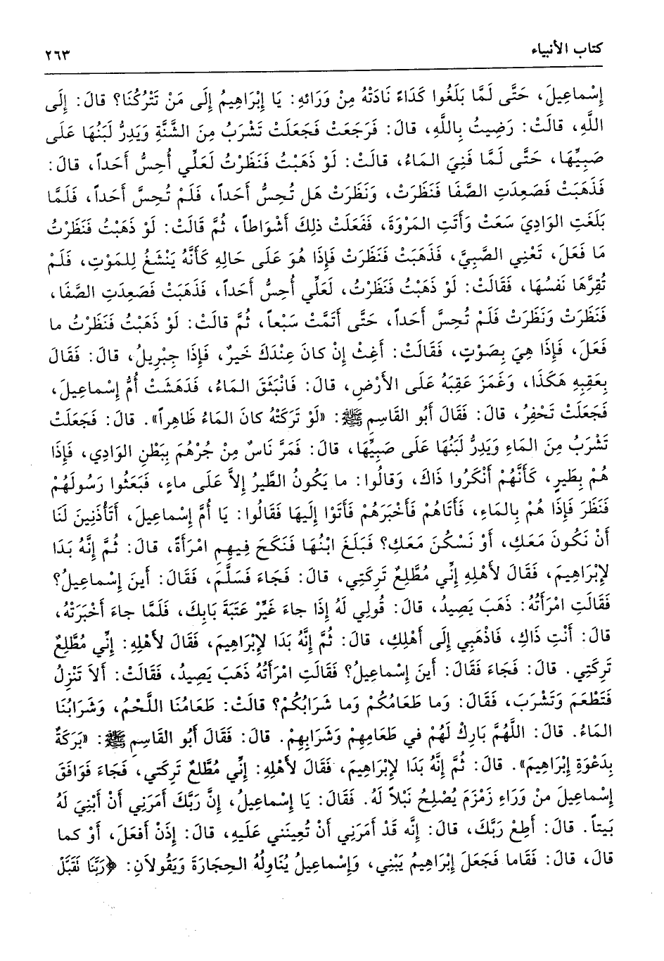 إِسْمَاعِيلَ، حَتَّى لَمَّا بَلَغُوا كَدَاءً نَادَتْهُ مِنْ وَرَائِهِ يَا إِبْرَاهِيمُ إِلَى مَنْ تَتْرُكُنَا قَالَ إِلَى اللَّهِ. قَالَتْ رَضِيتُ بِاللَّهِ. قَالَ فَرَجَعَتْ فَجَعَلَتْ تَشْرَبُ مِنَ الشَّنَّةِ وَيَدِرُّ لَبَنُهَا عَلَى صَبِيِّهَا، حَتَّى لَمَّا فَنِىَ الْمَاءُ قَالَتْ لَوْ ذَهَبْتُ فَنَظَرْتُ لَعَلِّى أُحِسُّ أَحَدًا. قَالَ فَذَهَبَتْ فَصَعِدَتِ الصَّفَا فَنَظَرَتْ وَنَظَرَتْ هَلْ تُحِسُّ أَحَدًا فَلَمْ تُحِسَّ أَحَدًا، فَلَمَّا بَلَغَتِ الْوَادِىَ سَعَتْ وَأَتَتِ الْمَرْوَةَ فَفَعَلَتْ ذَلِكَ أَشْوَاطًا، ثُمَّ قَالَتْ لَوْ ذَهَبْتُ فَنَظَرْتُ مَا فَعَلَ - تَعْنِى الصَّبِىَّ - فَذَهَبَتْ فَنَظَرَتْ، فَإِذَا هُوَ عَلَى حَالِهِ كَأَنَّهُ يَنْشَغُ لِلْمَوْتِ، فَلَمْ تُقِرَّهَا نَفْسُهَا، فَقَالَتْ لَوْ ذَهَبْتُ فَنَظَرْتُ لَعَلِّى أُحِسُّ أَحَدًا، فَذَهَبَتْ فَصَعِدَتِ الصَّفَا فَنَظَرَتْ وَنَظَرَتْ فَلَمْ تُحِسَّ أَحَدًا، حَتَّى أَتَمَّتْ سَبْعًا، ثُمَّ قَالَتْ لَوْ ذَهَبْتُ فَنَظَرْتُ مَا فَعَلَ، فَإِذَا هِىَ بِصَوْتٍ فَقَالَتْ أَغِثْ إِنْ كَانَ عِنْدَكَ خَيْرٌ. فَإِذَا جِبْرِيلُ، قَالَ فَقَالَ بِعَقِبِهِ هَكَذَا، وَغَمَزَ عَقِبَهُ عَلَى الأَرْضِ، قَالَ فَانْبَثَقَ الْمَاءُ، فَدَهَشَتْ أُمُّ إِسْمَاعِيلَ فَجَعَلَتْ تَحْفِزُ. قَالَ فَقَالَ أَبُو الْقَاسِمِ - صلى الله عليه وسلم - «لَوْ تَرَكَتْهُ كَانَ الْمَاءُ ظَاهِرًا». قَالَ فَجَعَلَتْ تَشْرَبُ مِنَ الْمَاءِ، وَيَدِرُّ لَبَنُهَا عَلَى صَبِيِّهَا - قَالَ - فَمَرَّ نَاسٌ مِنْ جُرْهُمَ بِبَطْنِ الْوَادِى، فَإِذَا هُمْ بِطَيْرٍ، كَأَنَّهُمْ أَنْكَرُوا ذَاكَ، وَقَالُوا مَا يَكُونُ الطَّيْرُ إِلاَّ عَلَى مَاءٍ. فَبَعَثُوا رَسُولَهُمْ، فَنَظَرَ فَإِذَا هُمْ بِالْمَاءِ، فَأَتَاهُمْ فَأَخْبَرَهُمْ فَأَتَوْا إِلَيْهَا، فَقَالُوا يَا أُمَّ إِسْمَاعِيلَ، أَتَأْذَنِينَ لَنَا أَنْ نَكُونَ مَعَكِ أَوْ نَسْكُنَ مَعَكِ فَبَلَغَ ابْنُهَا فَنَكَحَ فِيهِمُ امْرَأَةً، قَالَ ثُمَّ إِنَّهُ بَدَا لإِبْرَاهِيمَ فَقَالَ لأَهْلِهِ إِنِّى مُطَّلِعٌ تَرِكَتِى. قَالَ فَجَاءَ فَسَلَّمَ فَقَالَ أَيْنَ إِسْمَاعِيلُ فَقَالَتِ امْرَأَتُهُ ذَهَبَ يَصِيدُ. قَالَ قُولِى لَهُ إِذَا جَاءَ غَيِّرْ عَتَبَةَ بَابِكَ. فَلَمَّا جَاءَ أَخْبَرَتْهُ قَالَ أَنْتِ ذَاكِ فَاذْهَبِى إِلَى أَهْلِكِ. قَالَ ثُمَّ إِنَّهُ بَدَا لإِبْرَاهِيمَ فَقَالَ لأَهْلِهِ إِنِّى مُطَّلِعٌ تَرِكَتِى. قَالَ فَجَاءَ فَقَالَ أَيْنَ إِسْمَاعِيلُ فَقَالَتِ امْرَأَتُهُ ذَهَبَ يَصِيدُ، فَقَالَتْ أَلاَ تَنْزِلُ فَتَطْعَمَ وَتَشْرَبَ فَقَالَ وَمَا طَعَامُكُمْ وَمَا شَرَابُكُمْ قَالَتْ طَعَامُنَا اللَّحْمُ، وَشَرَابُنَا الْمَاءُ. قَالَ اللَّهُمَّ بَارِكْ لَهُمْ فِي طَعَامِهِمْ وَشَرَابِهِمْ. قَالَ فَقَالَ أَبُو الْقَاسِمِ - صلى الله عليه وسلم - «بَرَكَةٌ بِدَعْوَةِ إِبْرَاهِيمَ». قَالَ ثُمَّ إِنَّهُ بَدَا لإِبْرَاهِيمَ فَقَالَ لأَهْلِهِ إِنِّى مُطَّلِعٌ تَرِكَتِى. فَجَاءَ فَوَافَقَ إِسْمَاعِيلَ مِنْ وَرَاءِ زَمْزَمَ، يُصْلِحُ نَبْلاً لَهُ، فَقَالَ يَا إِسْمَاعِيلُ، إِنَّ رَبَّكَ أَمَرَنِى أَنْ أَبْنِىَ لَهُ بَيْتًا. قَالَ أَطِعْ رَبَّكَ. قَالَ إِنَّهُ قَدْ أَمَرَنِى أَنْ تُعِينَنِى عَلَيْهِ. قَالَ إِذًا أَفْعَلَ. أَوْ كَمَا قَالَ. قَالَ فَقَامَا فَجَعَلَ إِبْرَاهِيمُ يَبْنِى، وَإِسْمَاعِيلُ يُنَاوِلُهُ الْحِجَارَةَ، وَيَقُولاَنِ (رَبَّنَا تَقَبَّلْ