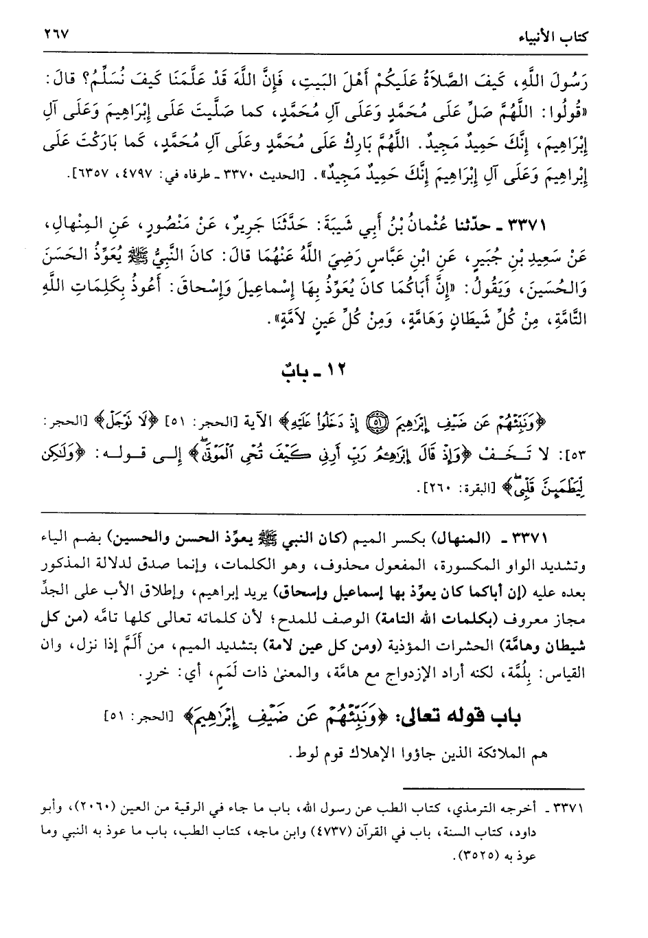 3371 - (المنهال) بكسر الميم (كان النبي - صلى الله عليه وسلم - يعوِّذ الحسن والحسين) بضم الياء وتشديد الواو المكسورة، المفعول محذوف، وهو الكلمات، وإنما صدق لدلالة المذكور بعده عليه (إن أباكما كان يعوِّذ بها إسماعيل واسحاق) يريد إبراهيم، وإطلاق الأب على الجدِّ مجاز معروف (بكلمات الله التامة) الوصف للمدح؛ لأن كلماته تعالى كلها تامَّة (من كل شيطان وهامَّة) الحشرات المؤذية (ومن كل عين لامة) بتشديد الميم، من أَلَمَّ إذا نزل، وإن القياس: بِلُمَّة، لكنه أراد الإزدواج مع هامَّة، والمعنى ذات لَمَمٍ، أي: خررٍ.
