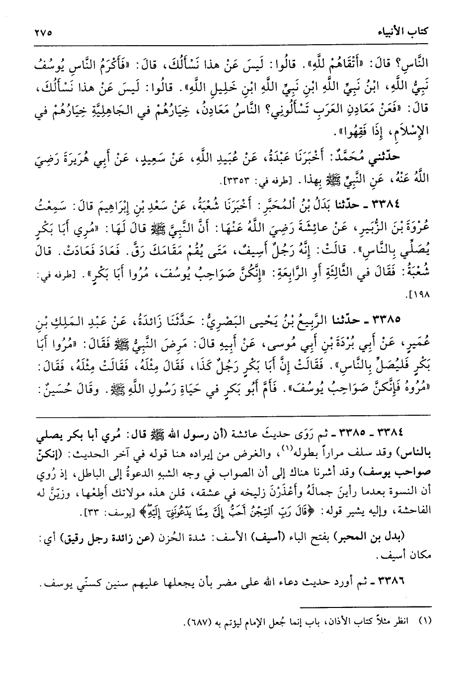 3384 - 3385 - ثم رَوَى حديثَ عائشة (أن رسول الله - صلى الله عليه وسلم - قال: مُري أبا بكر يصلي بالناس) وقد سلف مرارًا بطوله، والغرض من إيراده هنا قوله في آخر الحديث: (إنكن صواحب يوسف) وقد أشرنا هناك إلى أن الصواب في وجه الشبهِ الدعوةُ إلى الباطل، إذ رُوي أن النسوة بعدما رأينَ جمالَهُ واعْذَرْنَ زليخه في عشقه، قلن هذه مولاتك أَطِعْها، وزيَّنَ له الفاحشة، وإليه يشير قوله: {قَالَ رَبِّ السِّجْنُ أَحَبُّ إِلَيَّ مِمَّا يَدْعُونَنِي إِلَيْهِ} [يوسف: 33].