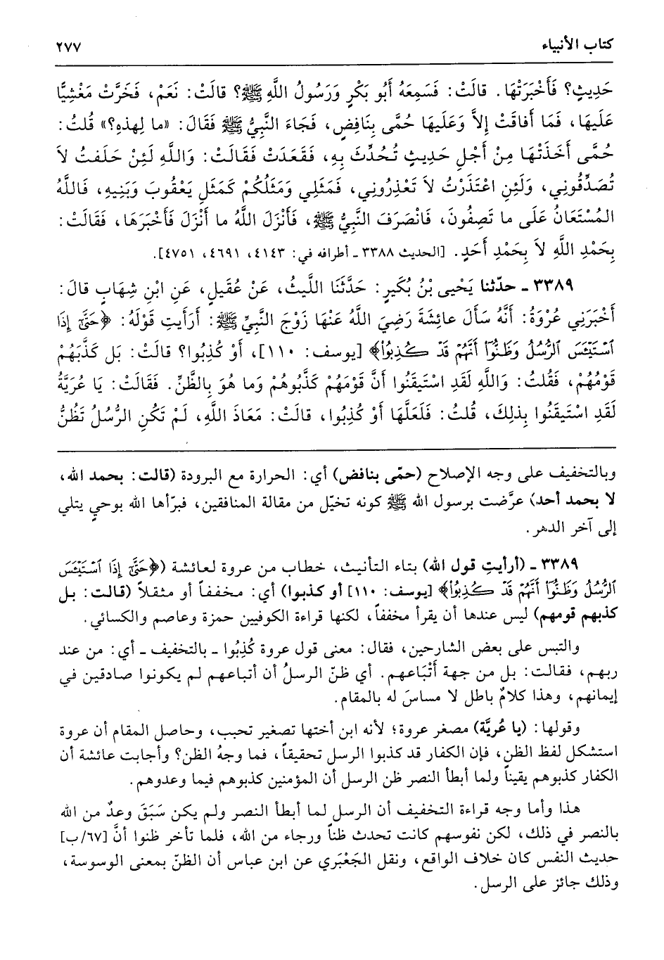 3389 - حَدَّثَنَا يَحْيَى بْنُ بُكَيْرٍ حَدَّثَنَا اللَّيْثُ عَنْ عُقَيْلٍ عَنِ ابْنِ شِهَابٍ قَالَ أَخْبَرَنِى عُرْوَةُ أَنَّهُ سَأَلَ عَائِشَةَ - رضى الله عنها - زَوْجَ النَّبِيِّ - صلى الله عليه وسلم - أَرَأَيْتِ قَوْلَهُ (حَتَّى إِذَا اسْتَيْأَسَ الرُّسُلُ وَظَنُّوا أَنَّهُمْ قَدْ كُذِّبُوا) أَوْ كُذِبُوا. قَالَتْ بَلْ كَذَّبَهُمْ قَوْمُهُمْ. فَقُلْتُ وَاللَّهِ لَقَدِ اسْتَيْقَنُوا أَنَّ قَوْمَهُمْ كَذَّبُوهُمْ وَمَا هُوَ بِالظَّنِّ. فَقَالَتْ يَا عُرَيَّةُ، لَقَدِ اسْتَيْقَنُوا بِذَلِكَ. قُلْتُ فَلَعَلَّهَا أَوْ كُذِبُوا. قَالَتْ مَعَاذَ اللَّهِ، لَمْ تَكُنِ الرُّسُلُ تَظُنُّ