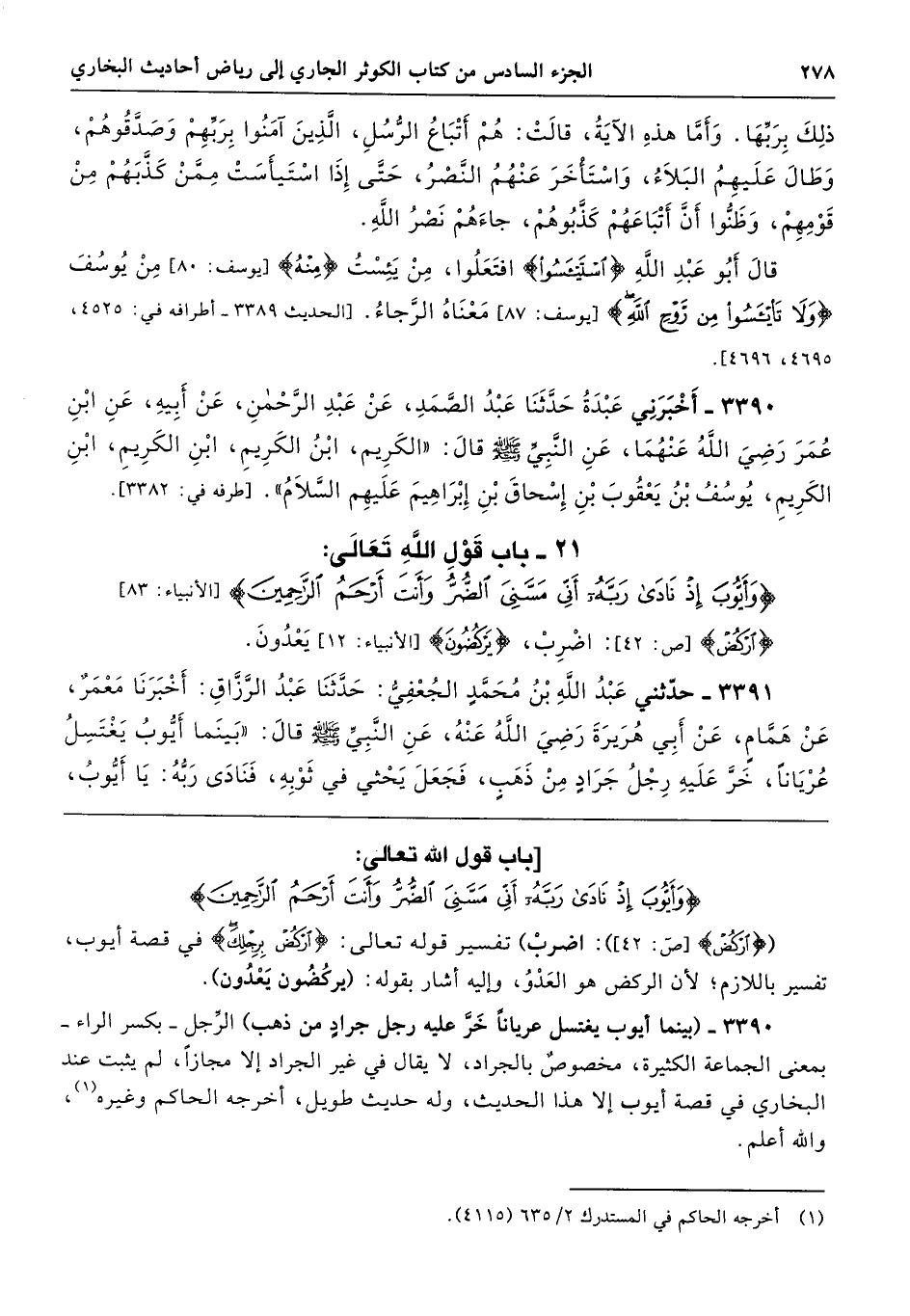 3390 - (بينما أيوب يغتسل عريانًا خَرَّ عليه رجل جرادٍ من ذهب) الرَّجل -بكسر الراء- بمعنى الجماعة الكثيرة، مخصوصٌ بالجراد، لا يقال في غير الجراد إلا مجازًا، لم يثبت عند البخاري في قصة أيوب إلا هذا الحديث، وله حديث طويل، أخرجه الحاكم وغيره، والله أعلم.