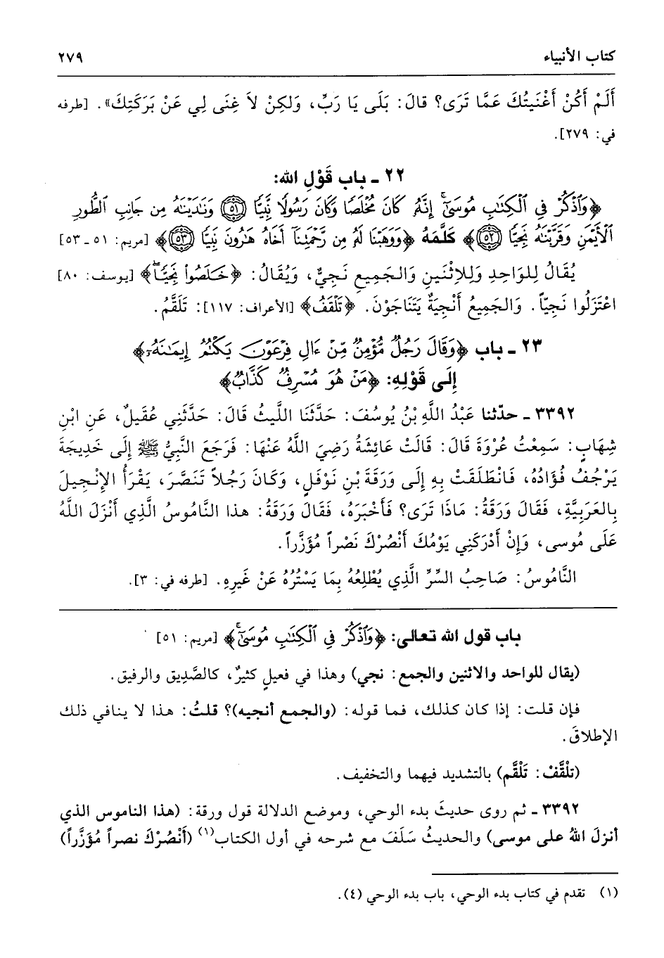 3392 - ثم روى حديثَ بدء الوحي، وموضع الدلالة قول ورقة: (هذا الناموس الذي أنزل الله على موسى) والحديثُ سَلَفَ مع شرحه في أول الكتاب (أَنْصُرْكَ نصرًا مُؤَزَّرًا)