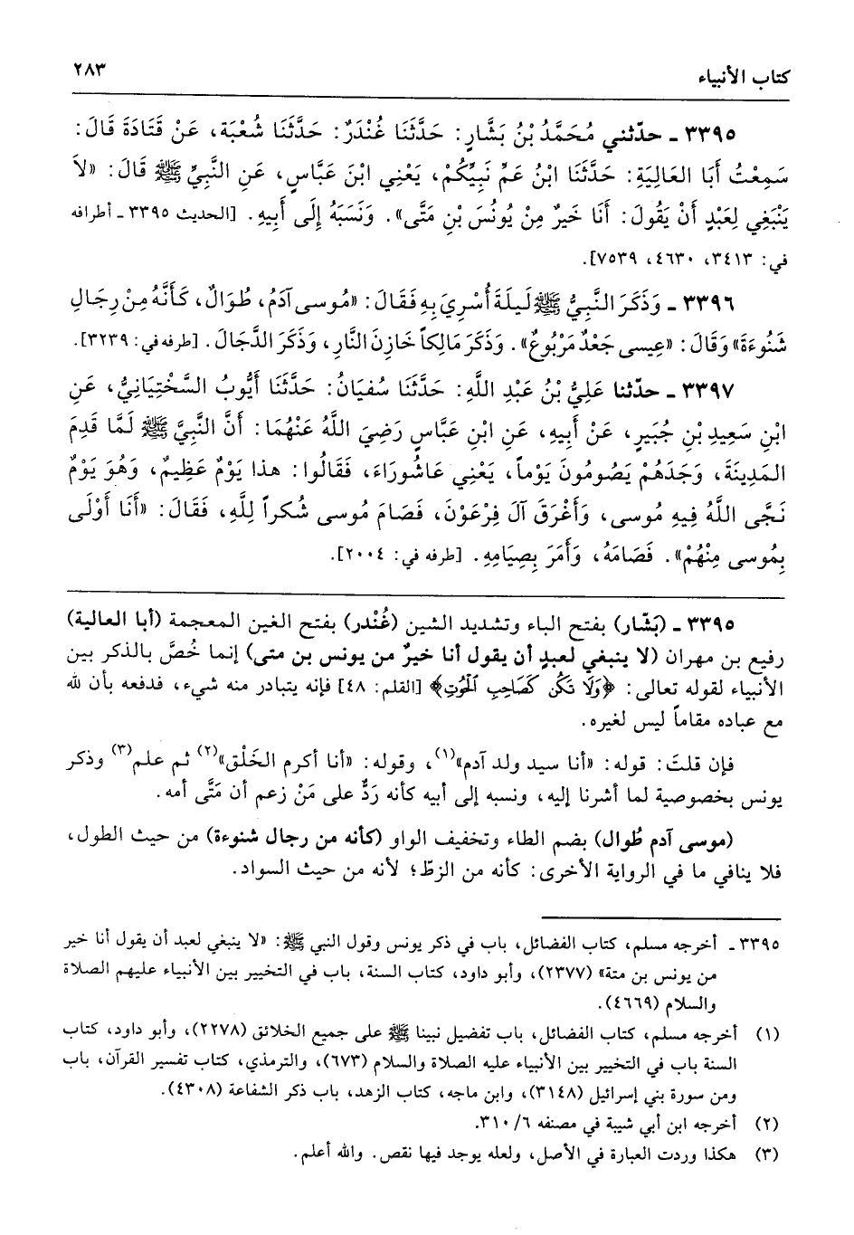 3395 - (بَشَّار) بفتح الباء وتشديد الشين (غُنْدر) بفتح الغين المعجمة (أبا العالية) رفيع بن مهران (لا ينبغي لعبدٍ أن يقول أنا خيرٌ من يونس بن متى) إنما خصَّ بالذكر بين الأنبياء لقوله تعالى: {فَاصْبِرْ وَلَا تَكُنْ كَصَاحِبِ الْحُوتِ} [القلم: 48] فإنه يتبادر منه شيء، فدفعه بأن الله مع عباده مقامًا ليس لغيره.