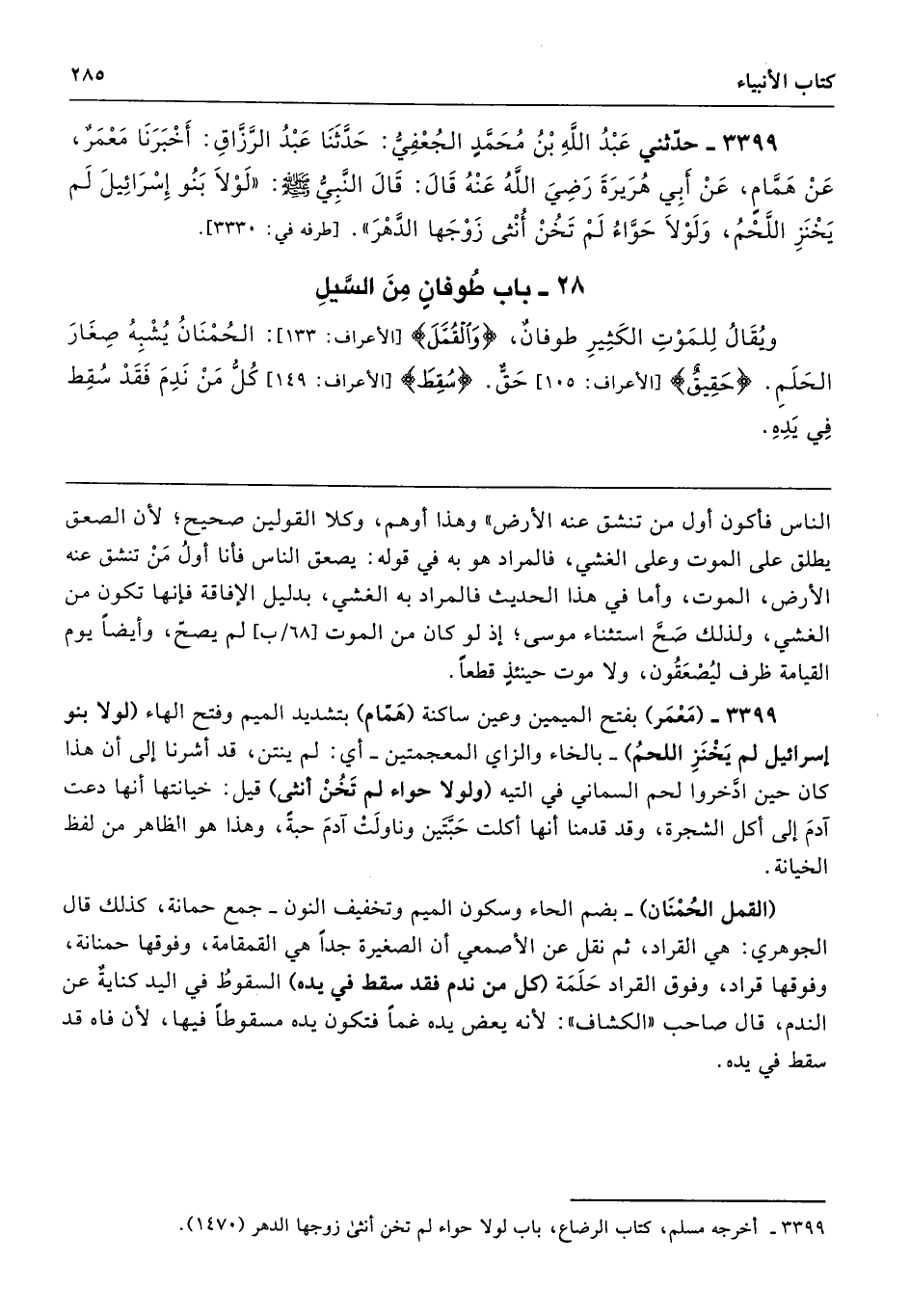 3399 - (مَعْمَر) بفتح الميمين وعين ساكنة (هَمّام) بتشديد الميم وفتح الهاء (لولا بنو إسرائيل لم يَخْنَزِ اللحمُ) -بالخاء والزاي المعجمتين- أي: لم ينتن، قد أشرنا إلى أن هذا كان حين ادَّخروا لحم السماني في التيه (ولولا حواء لم تَخُنْ أنثى) قيل: خيانتها أنها دعت آدمَ إلى أكل الشجرة، وقد قدمنا أنها أكلت حَبَّتَين وناولَتْ آدمَ حبةً، وهذا هو الظاهر من لفظ الخيانة.