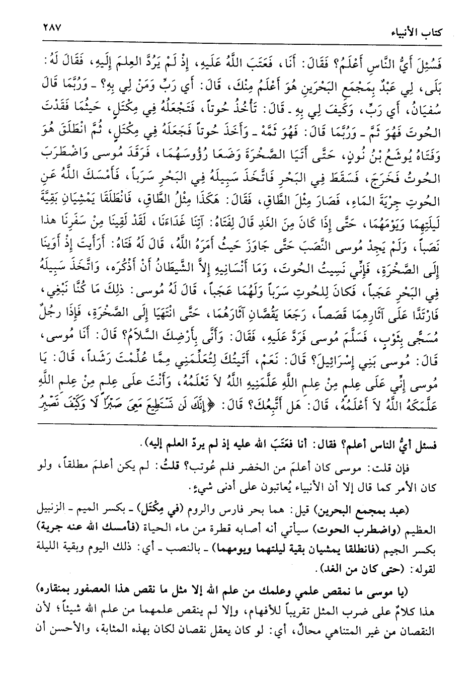 (عبد بمجمع البحرين) قيل: هما بحر فارس والروم (في مِكْتَل) -بكسر الميم- الزنبيل العظيم (واضطرب الحوت) سيأتي أنه أصابه قطرة من ماء الحياة (فأمسك الله عنه جرية) بكسر الجيم (فانطلقا يمشيان بقية ليلتهما ويومهما) -بالنصب- أي: ذلك اليوم وبقية الليلة لقوله: (حتى كان من الغد).