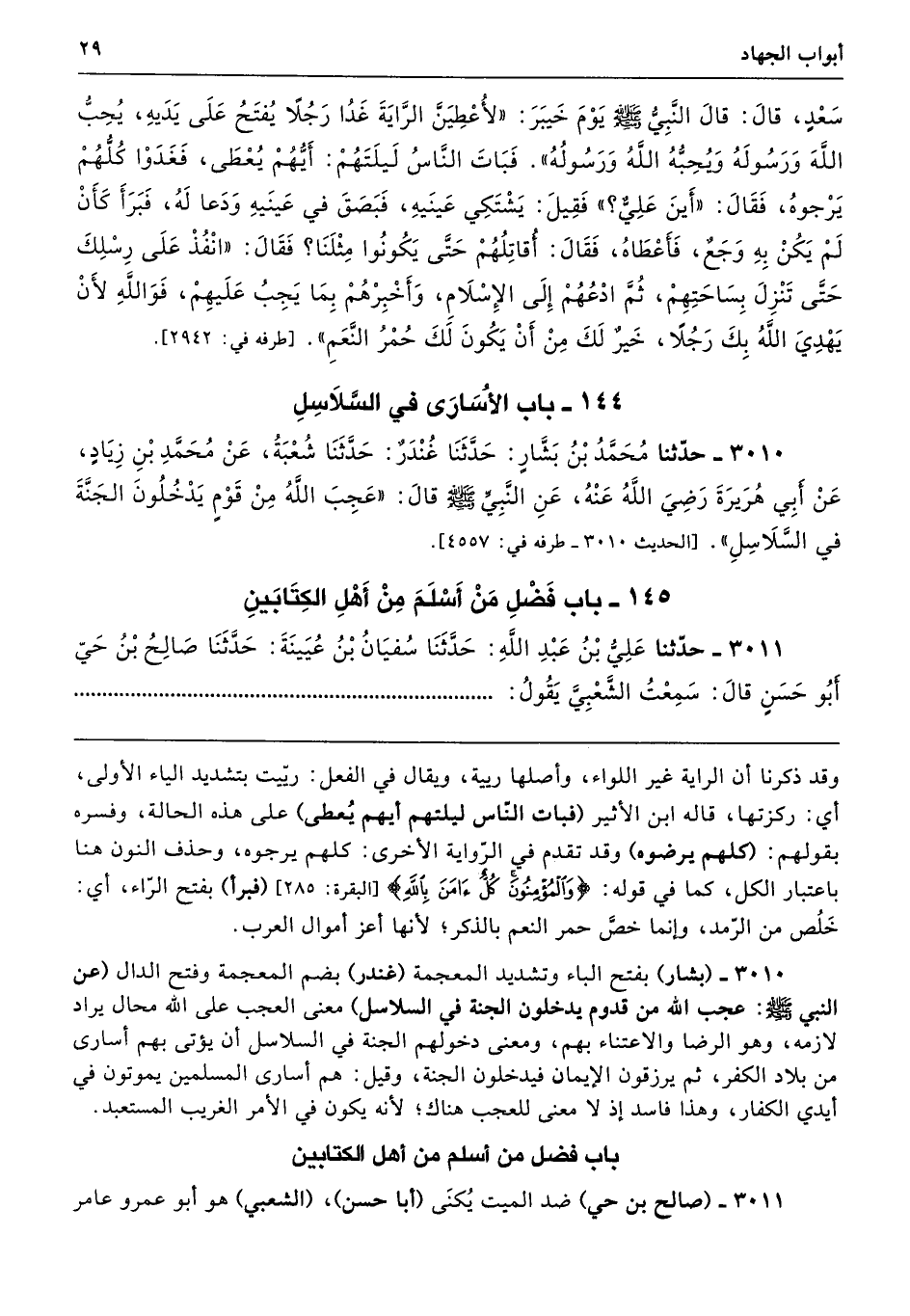 3010 - (بشار) بفتح الباء وتشديد المعجمة (غندر) بضم المعجمة وفتح الدال (عن النبي - صلى الله عليه وسلم -: عجب الله من قدوم يدخلون الجنة في السلاسل) معنى العجب على الله محال يراد لازمه، وهو الرضا والاعتناء بهم، ومعنى دخولهم الجنة في السلاسل أن يؤتى بهم أسارى من بلاد الكفر، ثم يرزقون الإيمان فيدخلون الجنة، وقيل: هم أسارى المسلمين يموتون في أيدي الكفار، وهذا فاسد إذ لا معنى للعجب هناك؛ لأنه يكون في الأمر الغريب المستعبد.