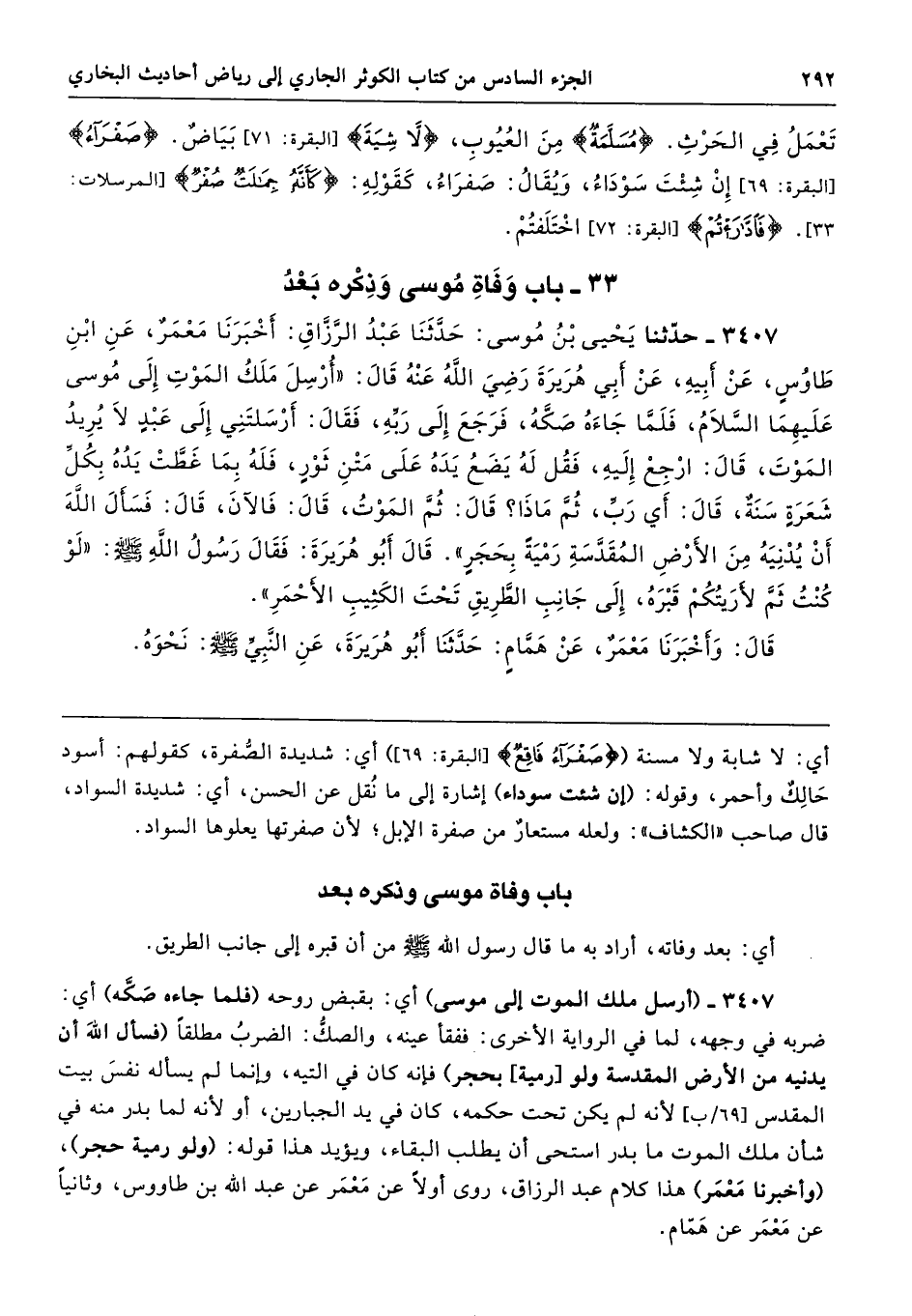 3407 - حَدَّثَنَا يَحْيَى بْنُ مُوسَى حَدَّثَنَا عَبْدُ الرَّزَّاقِ أَخْبَرَنَا مَعْمَرٌ عَنِ ابْنِ طَاوُسٍ عَنْ أَبِيهِ عَنْ أَبِى هُرَيْرَةَ - رضى الله عنه - قَالَ أُرْسِلَ مَلَكُ الْمَوْتِ إِلَى مُوسَى - عَلَيْهِمَا السَّلاَمُ - فَلَمَّا جَاءَهُ صَكَّهُ، فَرَجَعَ إِلَى رَبِّهِ، فَقَالَ أَرْسَلْتَنِى إِلَى عَبْدٍ لاَ يُرِيدُ الْمَوْتَ. قَالَ ارْجِعْ إِلَيْهِ، فَقُلْ لَهُ يَضَعُ يَدَهُ عَلَى مَتْنِ ثَوْرٍ، فَلَهُ بِمَا غَطَّتْ يَدُهُ بِكُلِّ شَعَرَةٍ سَنَةٌ. قَالَ أَىْ رَبِّ، ثُمَّ مَاذَا قَالَ ثُمَّ الْمَوْتُ. قَالَ فَالآنَ. قَالَ فَسَأَلَ اللَّهَ أَنْ يُدْنِيَهُ مِنَ الأَرْضِ الْمُقَدَّسَةِ رَمْيَةً بِحَجَرٍ. قَالَ أَبُو هُرَيْرَةَ فَقَالَ رَسُولُ اللَّهِ - صلى الله عليه وسلم - «لَوْ كُنْتُ ثَمَّ لأَرَيْتُكُمْ قَبْرَهُ إِلَى جَانِبِ الطَّرِيقِ تَحْتَ الْكَثِيبِ الأَحْمَرِ». قَالَ وَأَخْبَرَنَا مَعْمَرٌ عَنْ هَمَّامٍ حَدَّثَنَا أَبُو هُرَيْرَةَ عَنِ النَّبِيِّ - صلى الله عليه وسلم - نَحْوَهُ.