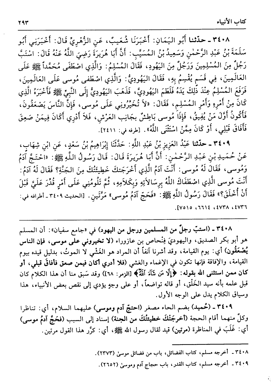 3408 - (استبَّ رجلٌ من المسلمين ورجل من اليهود) في "جامع سفيان": أن المسلم هو أبو بكر الصديق، واليهوديَ فِنْحاص بن عازوراء (لا تخيروني على موسى، فإن الناس يُصْعَقُون) أي: يوم القيامة، وقد أشرنا آنفًا أن المراد هو الغَشْي لا الموتُ، بدليل قيده بيوم القيامة، والإفاقة فإنها تكون في الإغماء والغشي (فلا أدري أكان فيمن صعق فأفاقَ قبلي، أو كان ممن استثنى الله بقوله: {إِلَّا مَا شَاءَ اللَّهُ} [الزمر: 68]) وقد سَبق منا أن هذا الكلام كان قبل علمه بأنه سيد الخَلْق، أو قاله تواضعًا، أو على وجهٍ يؤدي إلى نقص بعض الأنبياء، هذا وسياق الكلام يدل على الوجه الأول.