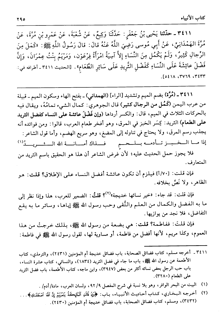 3411 - (مُرَّة) بضم الميم وتشديد [الراء] (الهمداني) -بفتح الهاء وسكون الميم- قبيلة من عرب اليمن (كَمُل من الرجال كثير) قال الجوهري: كمال الشيء تمامُهُ، ويقال فيه بالحركات الثلاث في الميم، قال: والكسر أرداها (وإن فَضْلَ عائشة على النساء كفضل الثريد على الطعام) الثريد: كِسَر الخبز في المرق، وهو أفخر طعام العرب، قالوا: ومن فوائده أنه يجذب رسم المرق، ولا يحتاج في تناوله إلى المضغ، وهو سريع الهضم، وأما قول الشاعر: