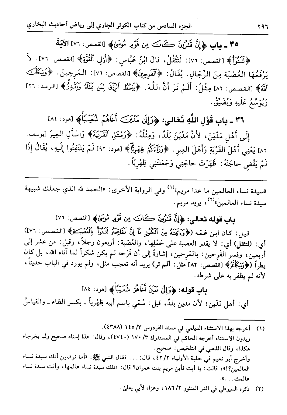 قيل: كان ابن عَمِّه ({وَآتَيْنَاهُ مِنَ الْكُنُوزِ مَا إِنَّ مَفَاتِحَهُ لَتَنُوءُ بِالْعُصْبَةِ} [القصص: 76]) أي: (لتثقل) أي: لا يقدر العصبة على حَمْلِها، والعُصْبة: أربعون رجلًا، وقيل: من عشر إلى أربعين، وفسر الفَرِحين: بالمَرِحين، إشارةً إلى أن فَرْحه لم يكن شكرًا لما آتاه الله، بل كان بطرًا ({وَيْكَأَنَّهُ} [القصص: 82] مثل: ألم تر) يريد أنه تعجب مثل، ولم يورد في الباب حديثًا، لأنه لم يظفر به على شرطه.