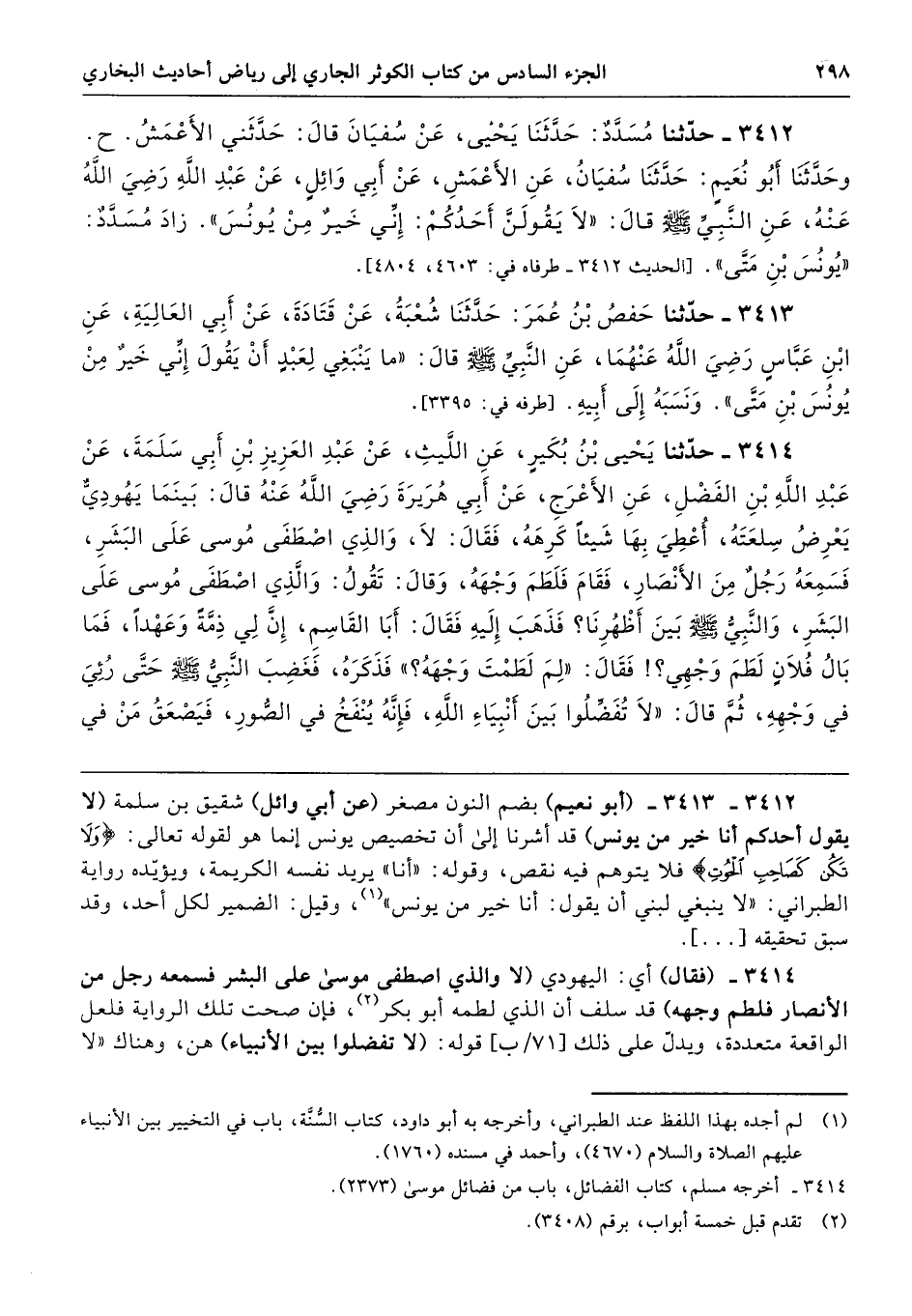 3412 - حَدَّثَنَا مُسَدَّدٌ حَدَّثَنَا يَحْيَى عَنْ سُفْيَانَ قَالَ حَدَّثَنِى الأَعْمَشُ. حَدَّثَنَا أَبُو نُعَيْمٍ حَدَّثَنَا سُفْيَانُ عَنِ الأَعْمَشِ عَنْ أَبِى وَائِلٍ عَنْ عَبْدِ اللَّهِ - رضى الله عنه - عَنِ النَّبِيِّ - صلى الله عليه وسلم - قَالَ «لاَ يَقُولَنَّ أَحَدُكُمْ إِنِّى خَيْرٌ مِنْ يُونُسَ». زَادَ مُسَدَّدٌ «يُونُسَ بْنِ مَتَّى». طرفاه 4603، 4804