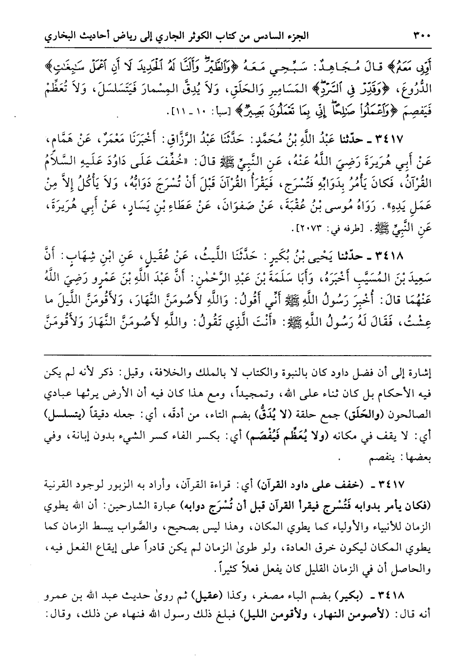 3417 - حَدَّثَنَا عَبْدُ اللَّهِ بْنُ مُحَمَّدٍ حَدَّثَنَا عَبْدُ الرَّزَّاقِ أَخْبَرَنَا مَعْمَرٌ عَنْ هَمَّامٍ عَنْ أَبِى هُرَيْرَةَ - رضى الله عنه - عَنِ النَّبِيِّ - صلى الله عليه وسلم - قَالَ «خُفِّفَ عَلَى دَاوُدَ - عَلَيْهِ السَّلاَمُ - الْقُرْآنُ، فَكَانَ يَأْمُرُ بِدَوَابِّهِ فَتُسْرَجُ، فَيَقْرَأُ الْقُرْآنَ قَبْلَ أَنْ تُسْرَجَ دَوَابُّهُ، وَلاَ يَأْكُلُ إِلاَّ مِنْ عَمَلِ يَدِهِ». رَوَاهُ مُوسَى بْنُ عُقْبَةَ عَنْ صَفْوَانَ عَنْ عَطَاءِ بْنِ يَسَارٍ عَنْ أَبِى هُرَيْرَةَ عَنِ النَّبِيِّ - صلى الله عليه وسلم -. طرفه 2073
