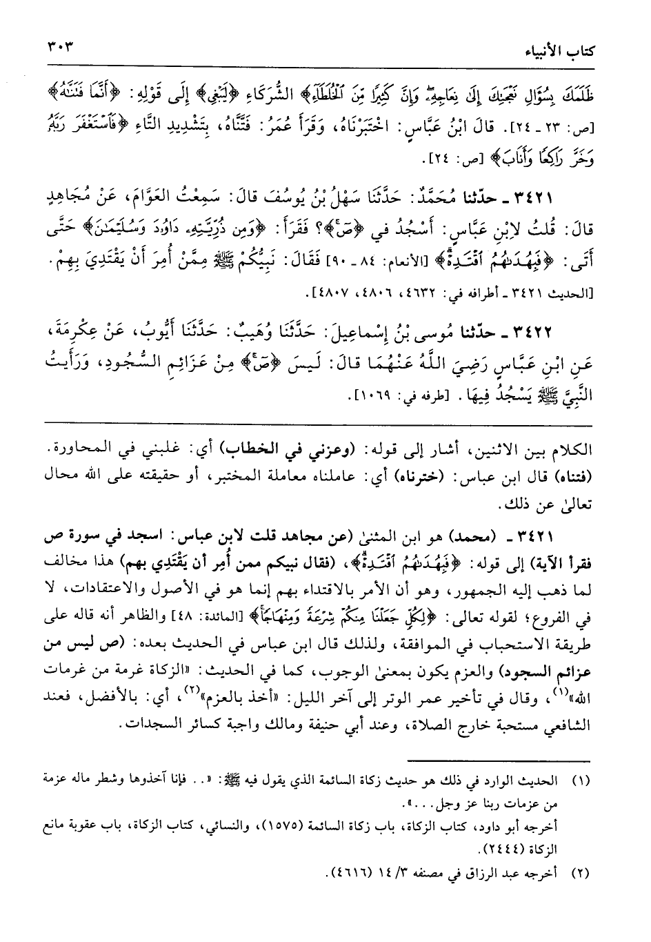 3421 - (محمد) هو ابن المثنى (عن مجاهد قلت لابن عباس: اسجد في سورة ص فقرأ الآية) إلى قوله: {فَبِهُدَاهُمُ اقْتَدِهْ}، (فقال نبيكم ممن أُمِر أن يَقْتَدِي بهم) هذا مخالف لما ذهب إليه الجمهور، وهو أن الأمر بالاقتداء بهم إنما هو في الأصول والاعتقادات، لا في الفروع؛ لقوله تعالى: {لِكُلٍّ جَعَلْنَا مِنْكُمْ شِرْعَةً وَمِنْهَاجًا} [المائدة: 48] والظاهر أنه قاله على طريقة الاستحباب في الموافقة، ولذلك قال ابن عباس في الحديث بعده: (ص ليس من عزائم السجود) والعزم يكون بمعنى الوجوب، كما في الحديث: "الزكاة غرمة من غرمات الله"، وقال في تأخير عمر الوتر إلى آخر الليل: "أخذ بالعزم"، أي: بالأفضل، فعند الشافعي مستحبة خارج الصلاة، وعند أبي حنيفة ومالك واجبة كسائر السجدات.