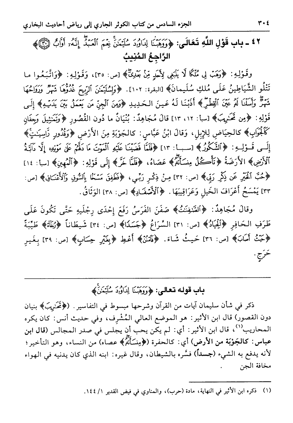 وَقَوْلُهُ (هَبْ لِى مُلْكًا لاَ يَنْبَغِى لأَحَدٍ مِنْ بَعْدِى) وَقَوْلُهُ (وَاتَّبَعُوا مَا تَتْلُوا الشَّيَاطِينُ عَلَى مُلْكِ سُلَيْمَانَ) (وَلِسُلَيْمَانَ الرِّيحَ غُدُوُّهَا شَهْرٌ وَرَوَاحُهَا شَهْرٌ وَأَسَلْنَا لَهُ عَيْنَ الْقِطْرِ) أَذَبْنَا لَهُ عَيْنَ الْحَدِيدِ (وَمِنَ الْجِنِّ مَنْ يَعْمَلُ بَيْنَ يَدَيْهِ) إِلَى قَوْلِهِ (مِنْ مَحَارِيبَ) قَالَ مُجَاهِدٌ بُنْيَانٌ مَا دُونَ الْقُصُورِ (وَتَمَاثِيلَ وَجِفَانٍ كَالْجَوَابِ) كَالْحِيَاضِ لِلإِبِلِ. وَقَالَ ابْنُ عَبَّاسٍ كَالْجَوْبَةِ مِنَ الأَرْضِ (وَقُدُورٍ رَاسِيَاتٍ) إِلَى قَوْلِهِ (الشَّكُورُ)، (فَلَمَّا قَضَيْنَا عَلَيْهِ الْمَوْتَ مَا دَلَّهُمْ عَلَى مَوْتِهِ إِلاَّ دَابَّةُ الأَرْضِ) الأَرَضَةُ (تَأْكُلُ مِنْسَأَتَهُ) عَصَاهُ (فَلَمَّا خَرَّ) إِلَى قَوْلِهِ (الْمُهِينِ) (حُبَّ الْخَيْرِ عَنْ ذِكْرِ رَبِّى) (فَطَفِقَ مَسْحًا بِالسُّوقِ وَالأَعْنَاقِ) يَمْسَحُ أَعْرَافَ الْخَيْلِ وَعَرَاقِيبَهَا الأَصْفَادُ الْوَثَاقُ. قَالَ مُجَاهِدٌ (الصَّافِنَاتُ) صَفَنَ الْفَرَسُ رَفَعَ إِحْدَى رِجْلَيْهِ حَتَّى تَكُونَ عَلَى طَرَفِ الْحَافِرِ. (الْجِيَادُ) السِّرَاعُ. (جَسَدًا) شَيْطَانًا. (رُخَاءً) طَيِّبَةً، (حَيْثُ أَصَابَ) حَيْثُ شَاءَ. (فَامْنُنْ) أَعْطِ. (بِغَيْرِ حِسَابٍ) بِغَيْرِ حَرَجٍ.