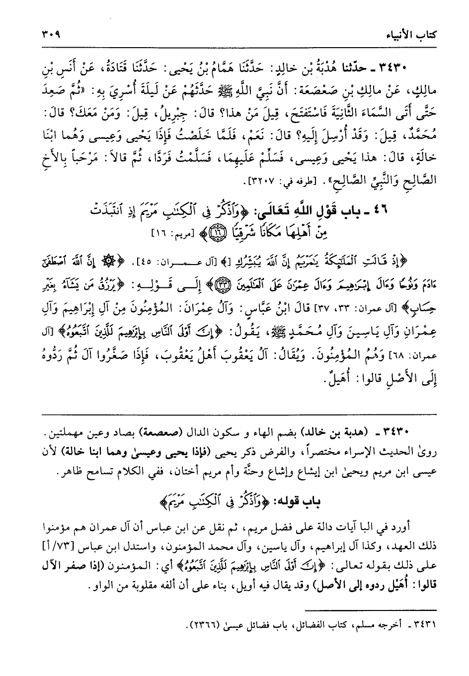 3430 - (هدبة بن خالد) بضم الهاء وسكون الدال (صعصعة) بصاد وعين مهملتين. روى الحديث الإسراء مختصرًا، والفرض ذكر يحيى (فإذا يحيى وعيسى وهما ابنا خالة) لأن عيسى ابن مريم ويحيى ابن إيشاع وإشاع وحنَّة وأم مريم أختان، ففي الكلام تسامح ظاهر.