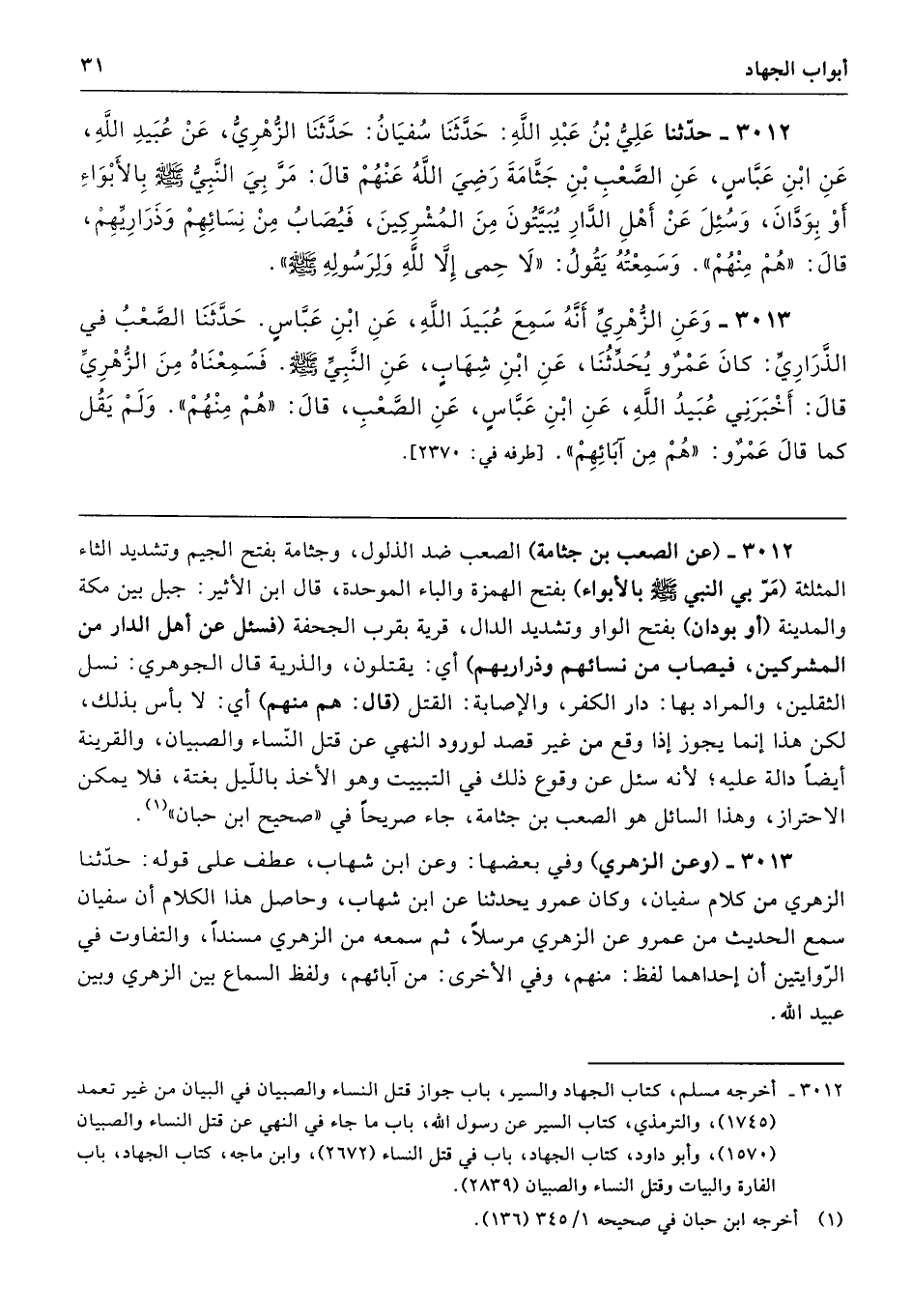 3012 - حَدَّثَنَا عَلِىُّ بْنُ عَبْدِ اللَّهِ حَدَّثَنَا سُفْيَانُ حَدَّثَنَا الزُّهْرِىُّ عَنْ عُبَيْدِ اللَّهِ عَنِ ابْنِ عَبَّاسٍ عَنِ الصَّعْبِ بْنِ جَثَّامَةَ - رضى الله عنهم - قَالَ مَرَّ بِىَ النَّبِىُّ - صلى الله عليه وسلم - بِالأَبْوَاءِ - أَوْ بِوَدَّانَ - وَسُئِلَ عَنْ أَهْلِ الدَّارِ يُبَيَّتُونَ مِنَ الْمُشْرِكِينَ، فَيُصَابُ مِنْ نِسَائِهِمْ وَذَرَارِيِّهِمْ قَالَ «هُمْ مِنْهُمْ». وَسَمِعْتُهُ يَقُولُ «لاَ حِمَى إِلاَّ لِلَّهِ وَلِرَسُولِهِ - صلى الله عليه وسلم -».