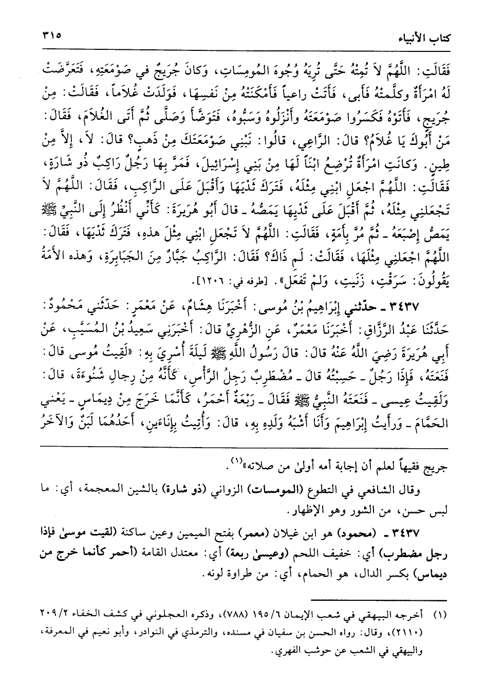 3437 - حَدَّثَنِى إِبْرَاهِيمُ بْنُ مُوسَى أَخْبَرَنَا هِشَامٌ عَنْ مَعْمَرٍ. حَدَّثَنِى مَحْمُودٌ حَدَّثَنَا عَبْدُ الرَّزَّاقِ أَخْبَرَنَا مَعْمَرٌ عَنِ الزُّهْرِىِّ قَالَ أَخْبَرَنِى سَعِيدُ بْنُ الْمُسَيَّبِ عَنْ أَبِى هُرَيْرَةَ - رضى الله عنه - قَالَ قَالَ رَسُولُ اللَّهِ - صلى الله عليه وسلم - «لَيْلَةَ أُسْرِىَ بِهِ لَقِيتُ مُوسَى - قَالَ فَنَعَتَهُ - فَإِذَا رَجُلٌ - حَسِبْتُهُ قَالَ - مُضْطَرِبٌ رَجِلُ الرَّأْسِ، كَأَنَّهُ مِنْ رِجَالِ شَنُوءَةَ - قَالَ - وَلَقِيتُ عِيسَى - فَنَعَتَهُ النَّبِىُّ - صلى الله عليه وسلم - فَقَالَ - رَبْعَةٌ أَحْمَرُ كَأَنَّمَا خَرَجَ مِنْ دِيمَاسٍ - يَعْنِى الْحَمَّامَ - وَرَأَيْتُ إِبْرَاهِيمَ، وَأَنَا أَشْبَهُ وَلَدِهِ بِهِ - قَالَ - وَأُتِيتُ بِإِنَاءَيْنِ أَحَدُهُمَا لَبَنٌ وَالآخَرُ