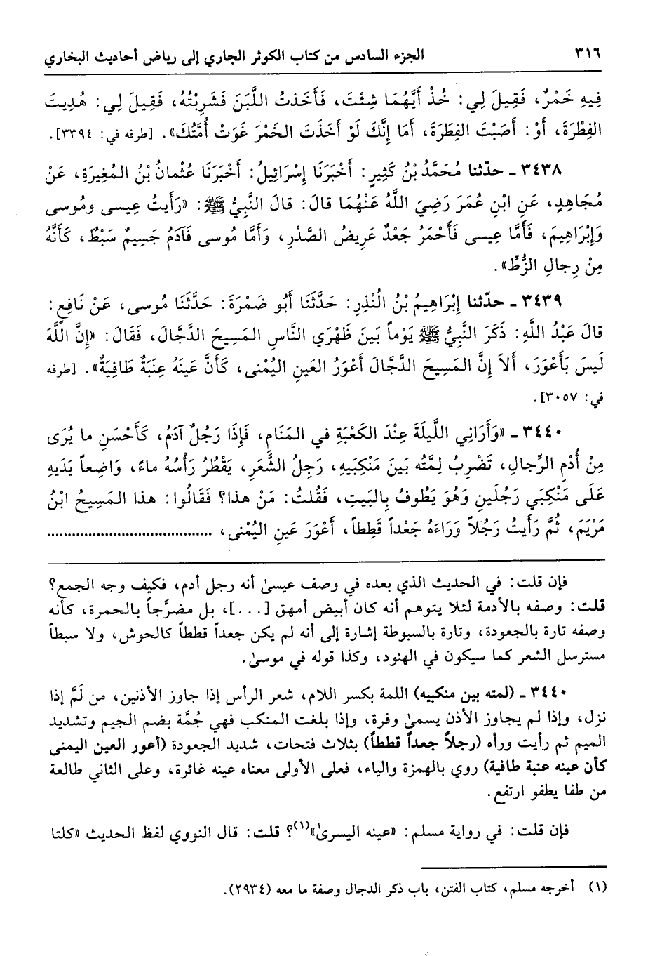 3440 - «وَأَرَانِى اللَّيْلَةَ عِنْدَ الْكَعْبَةِ فِي الْمَنَامِ، فَإِذَا رَجُلٌ آدَمُ كَأَحْسَنِ مَا يُرَى مِنْ أُدْمِ الرِّجَالِ، تَضْرِبُ لِمَّتُهُ بَيْنَ مَنْكِبَيْهِ، رَجِلُ الشَّعَرِ، يَقْطُرُ رَأْسُهُ مَاءً، وَاضِعًا يَدَيْهِ عَلَى مَنْكِبَىْ رَجُلَيْنِ وَهْوَ يَطُوفُ بِالْبَيْتِ. فَقُلْتُ مَنْ هَذَا فَقَالُوا هَذَا الْمَسِيحُ ابْنُ مَرْيَمَ. ثُمَّ رَأَيْتُ رَجُلاً وَرَاءَهُ جَعْدًا قَطَطًا أَعْوَرَ عَيْنِ الْيُمْنَى
