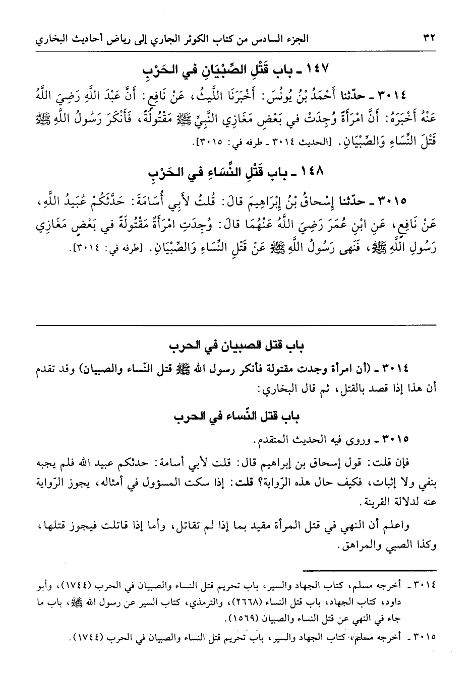 3014 - (أن امرأة وجدت مقتولة فأنكر رسول الله صلى الله عليه وسلم - قتل النّساء والصبيان) وقد تقدم أن هذا إذا قصد بالقتل، ثم قال البخاري: