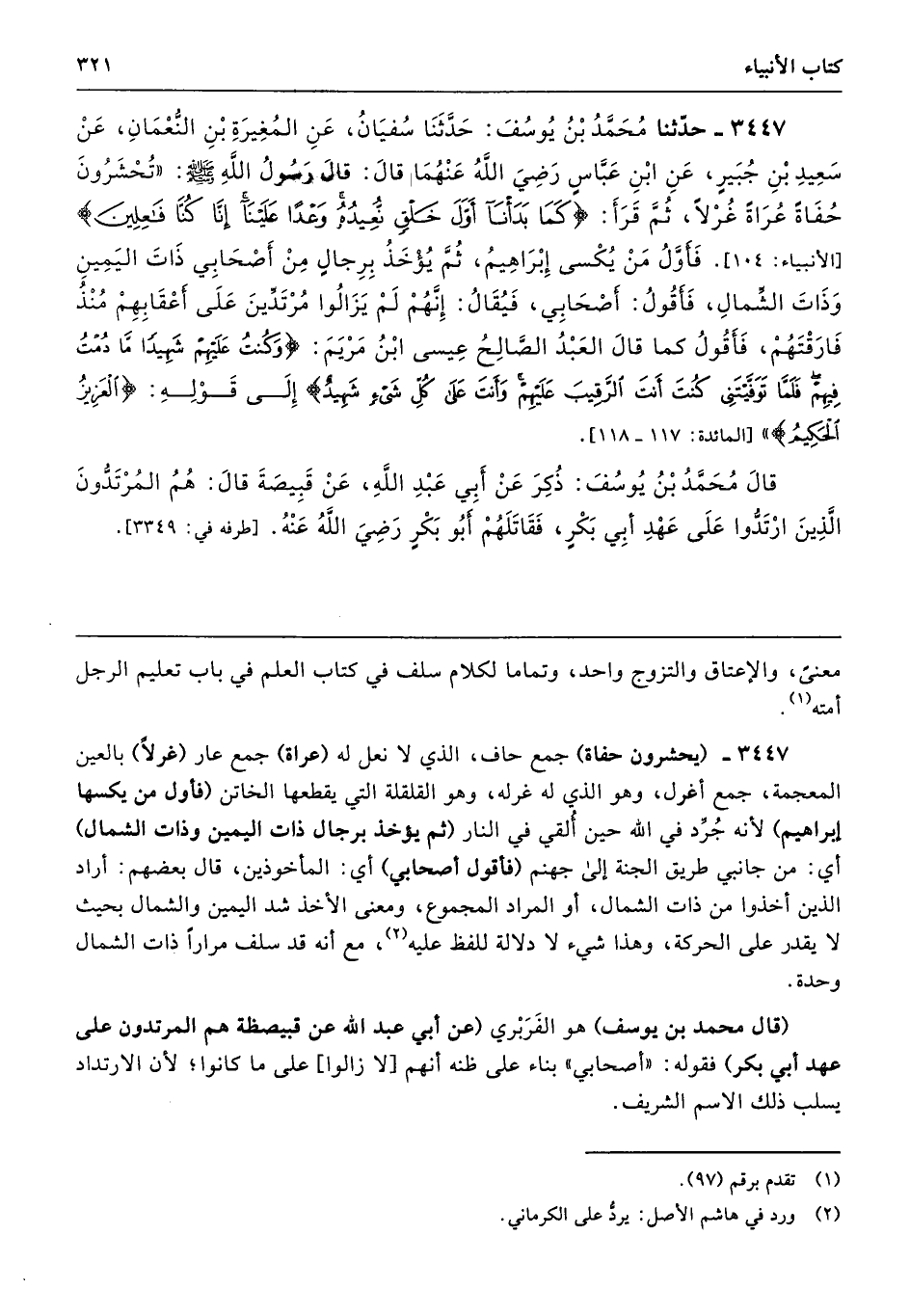 3447 - (يحشرون حفاة) جمع حاف، الذي لا نعل له (عراة) جمع عار (غرلًا) بالعين المعجمة، جمع أغرل، وهو الذي له غرله، وهو القلقلة التي يقطعها الخاتن (فأول من يكسها إبراهيم) لأنه جُرِّد في الله حين أُلقي في النار (ثم يؤخذ برجال ذات اليمين وذات الشمال) أي: من جانبي طريق الجنة إلى جهنم (فأقول أصحابي) أي: المأخوذين، قال بعضهم: أراد الذين أخذوا من ذات الشمال، أو المراد المجموع، ومعنى الأخذ شد اليمين والشمال بحيث لا يقدر على الحركة، وهذا شيء لا دلالة للفظ عليه، مع أنه قد سلف مرارًا ذات الشمال وحدة.