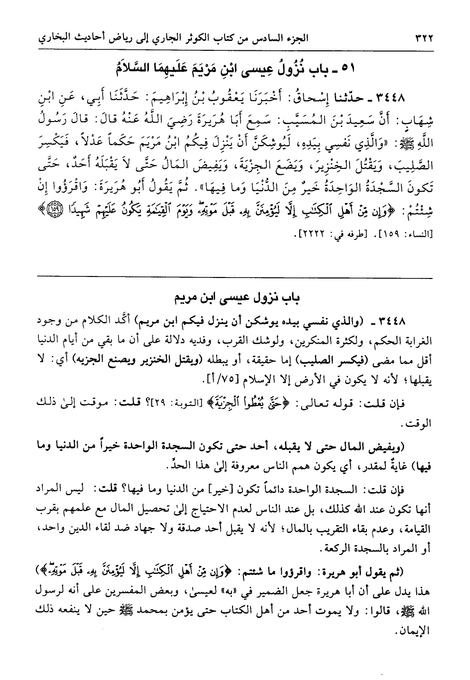 3448 - حَدَّثَنَا إِسْحَاقُ أَخْبَرَنَا يَعْقُوبُ بْنُ إِبْرَاهِيمَ حَدَّثَنَا أَبِى عَنْ صَالِحٍ عَنِ ابْنِ شِهَابٍ أَنَّ سَعِيدَ بْنَ الْمُسَيَّبِ سَمِعَ أَبَا هُرَيْرَةَ - رضى الله عنه - قَالَ قَالَ رَسُولُ اللَّهِ - صلى الله عليه وسلم - «وَالَّذِى نَفْسِى بِيَدِهِ، لَيُوشِكَنَّ أَنْ يَنْزِلَ فِيكُمُ ابْنُ مَرْيَمَ حَكَمًا عَدْلاً، فَيَكْسِرَ الصَّلِيبَ، وَيَقْتُلَ الْخِنْزِيرَ، وَيَضَعَ الْجِزْيَةَ، وَيَفِيضَ الْمَالُ حَتَّى لاَ يَقْبَلَهُ أَحَدٌ، حَتَّى تَكُونَ السَّجْدَةُ الْوَاحِدَةُ خَيْرًا مِنَ الدُّنْيَا وَمَا فِيهَا». ثُمَّ يَقُولُ أَبُو هُرَيْرَةَ وَاقْرَءُوا إِنْ شِئْتُمْ (وَإِنْ مِنْ أَهْلِ الْكِتَابِ إِلاَّ لَيُؤْمِنَنَّ بِهِ قَبْلَ مَوْتِهِ وَيَوْمَ الْقِيَامَةِ يَكُونُ عَلَيْهِمْ شَهِيدًا). طرفه 2222