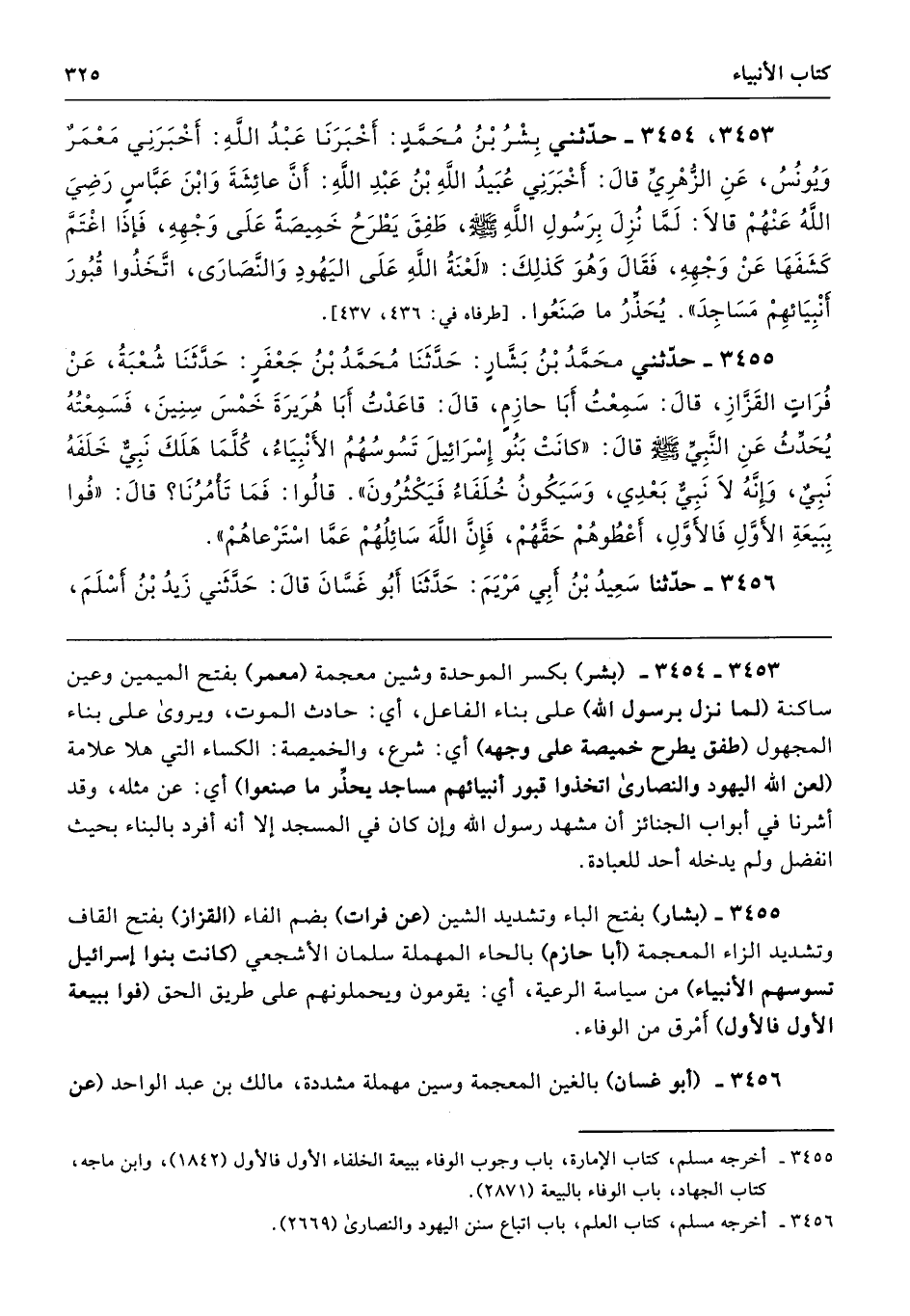 3453 - 3454 - (بئر) بكسر الموحدة وشين معجمة (معمر) بفتح الميمين وعين ساكنة (لما نزل برسول الله) على بناء الفاعل، أي: حادث الموت، ويروى على بناء المجهول (طفق يطرح خميصة على وجهه) أي: شرع، والخميصة: الكساء التي هلا علامة (لعن الله اليهود والنصارى اتخذوا قبور أنبيائهم مساجد يحذِّر ما صنعوا) أي: عن مثله، وقد أشرنا في أبواب الجنائز أن مشهد رسول الله وإن كان في المسجد إلا أنه أفرد بالبناء بحيث انفضل ولم يدخله أحد للعبادة.