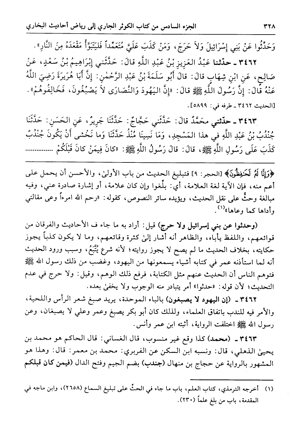 (وحدثوا عن بني إسرائيل ولا حرج) قيل: أراد به ما جاء في الأحاديث والفرقان من قوائعهم، واللفظ يأباه، والظاهر أنه أشار إلى كثرة وقائعهم، وما لا يكون كذبًا يجوز حكايته، بخلاف الحديث ما لم يصح لا يجوز روايته؛ لأنه شرع يُتَّبَعُ، وسبب ورود الحديث أنه لما استأذنه عمر في كتابه أشياء يسمعونها من اليهود، وغضب من ذلك رسول الله صلى الله عليه وسلم فتوهم الناس أن الحديث عنهم مثل الكتابة، فرفع ذلك الوهم، وقيل: ولا حرج في عدم التحديث؛ لأن قوله: "حدثوا" أمر يتبادر منه الوجوب ولا يخفى بعده.