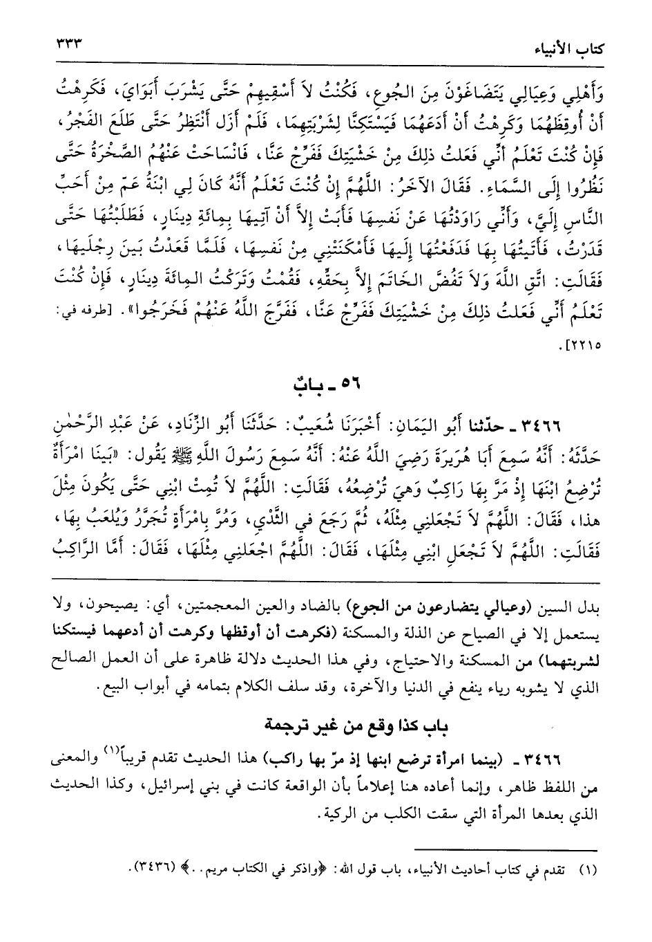 3466 - (بينما امرأة ترضع ابنها إذ مرّ بها راكب) هذا الحديث تقدم قريبًا والمعنى من اللفظ ظاهر، وإنما أعاده هنا إعلامًا بأن الواقعة كانت في بني إسرائيل، وكذا الحديث الذي بعدها المرأة التي سقت الكلب من الركية.
