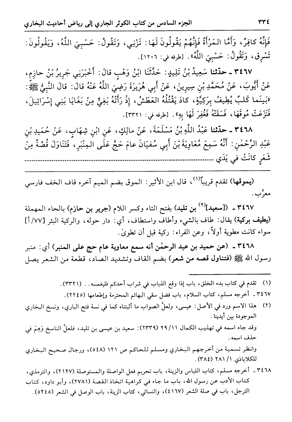 3467 - ([سعيد] بن تليد) بفتح التاء وكسر اللام (جرير بن حازم) بالحاء المهملة (يطيف بركية) يقال: طاف بالشيء وأطاف واستطاف، أي: دار حوله، والركية البئر سواء كانت مطوية أولًا، وعن الفراء: ركية قبل أن تطوى.