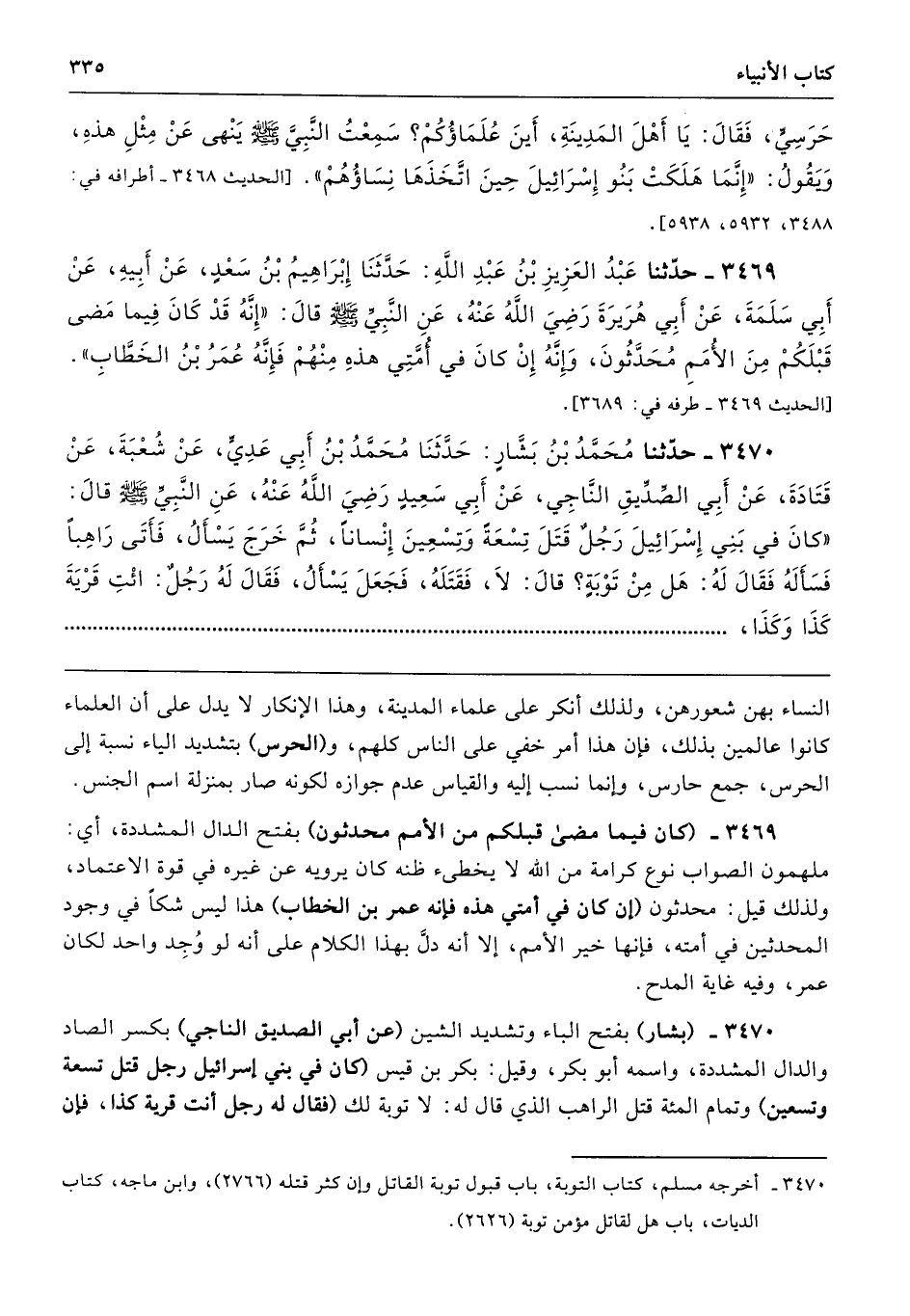 3470 - حَدَّثَنَا مُحَمَّدُ بْنُ بَشَّارٍ حَدَّثَنَا مُحَمَّدُ بْنُ أَبِى عَدِىٍّ عَنْ شُعْبَةَ عَنْ قَتَادَةَ عَنْ أَبِى الصِّدِّيقِ النَّاجِىِّ عَنْ أَبِى سَعِيدٍ - رضى الله عنه - عَنِ النَّبِيِّ - صلى الله عليه وسلم - قَالَ «كَانَ فِي بَنِى إِسْرَائِيلَ رَجُلٌ قَتَلَ تِسْعَةً وَتِسْعِينَ إِنْسَانًا ثُمَّ خَرَجَ يَسْأَلُ، فَأَتَى رَاهِبًا فَسَأَلَهُ، فَقَالَ لَهُ هَلْ مِنْ تَوْبَةٍ قَالَ لاَ. فَقَتَلَهُ، فَجَعَلَ يَسْأَلُ، فَقَالَ لَهُ رَجُلٌ ائْتِ قَرْيَةَ كَذَا وَكَذَا.