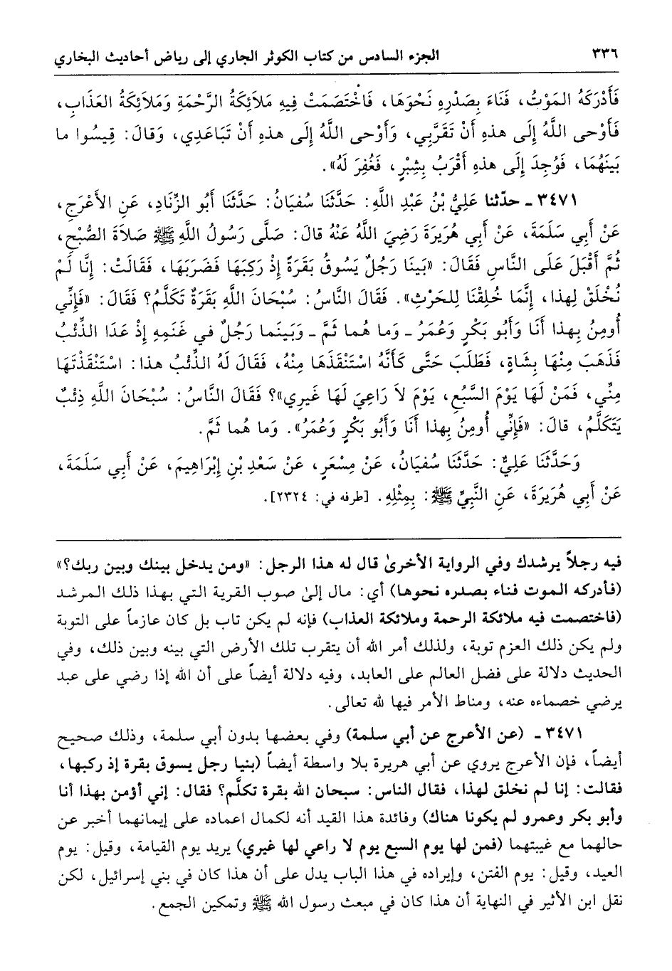 3471 - (عن الأعرج عن أبي سلمة) وفي بعضها بدون أبي سلمة، وذلك صحيح أيضًا، فإن الأعرج يروي عن أبي هريرة بلا واسطة أيضًا (بنيا رجل يسوق بقرة إذ ركبها، فقالت: إنا لم نخلق لهذا، فقال الناس: سبحان الله بقرة تكلَّم؟ فقال: إني أؤمن بهذا أنا وأبو بكر وعمرو لم يكونا هناك) وفائدة هذا القيد أنه لكمال اعماده على إيمانهما أخبر عن حالهما مع غيبتهما (فمن لها يوم السبع يوم لا راعي لها غيري) يريد يوم القيامة، وقيل: يوم العيد، وقيل: يوم الفتن، وإيراده في هذا الباب يدل على أن هذا كان في بني إسرائيل، لكن نقل ابن الأثير في النهاية أن هذا كان في مبعث رسول الله صلى الله عليه وسلم وتمكين الجمع.
