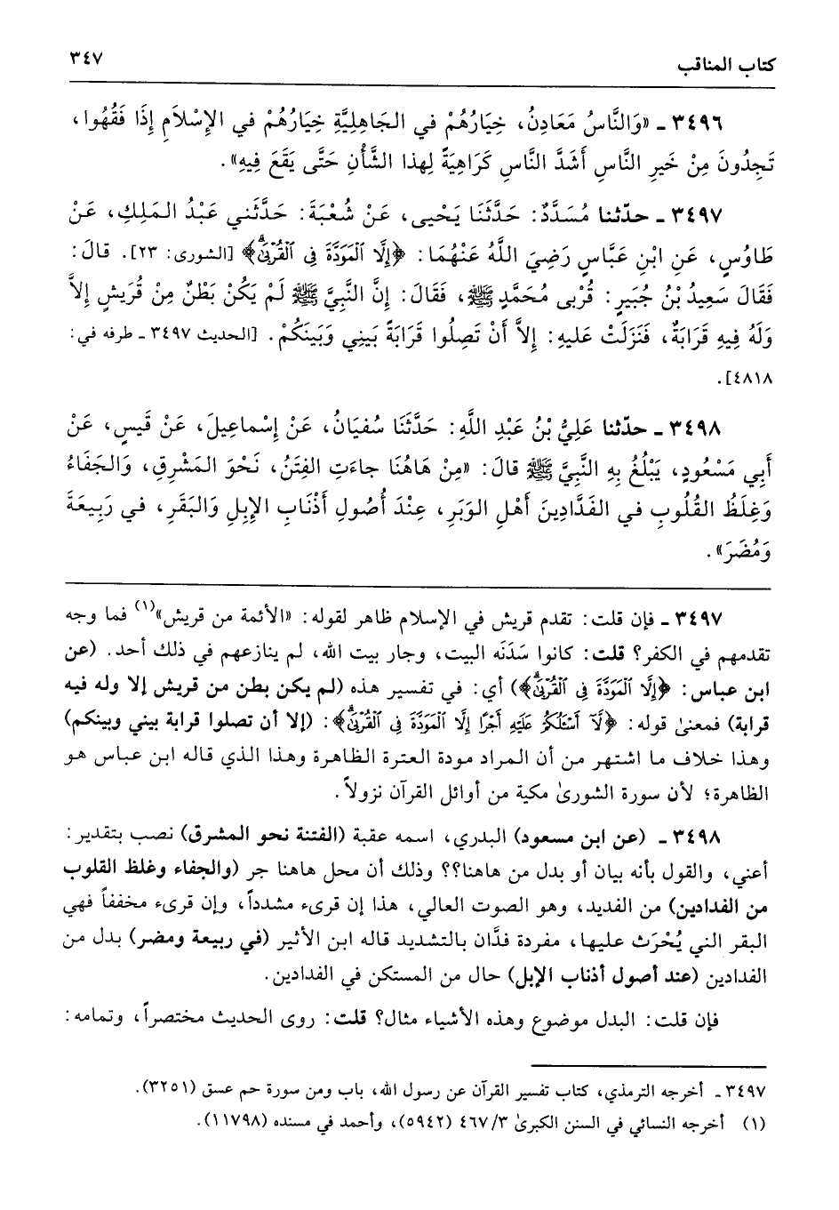 3497 - فإن قلت: تقدم قريش في الإسلام ظاهر لقوله: "الأئمة من قريش" فما وجه تقدمهم في الكفر؟ قلت: كانوا سَدَنَه البيت، وجار بيت الله، لم ينازعهم في ذلك أحد. (عن ابن عباس: {إِلَّا الْمَوَدَّةَ فِي الْقُرْبَى} أي: في تفسير هذه (لم يكن بطن من قريش إلا وله فيه قرابة) فمعنى قوله: {لَا أَسْأَلُكُمْ عَلَيْهِ أَجْرًا إِلَّا الْمَوَدَّةَ فِي الْقُرْبَى}: (إلا أن تصلوا قرابة بيني وبينكم) وهذا خلاف ما اشتهر من أن المراد مودة العترة الظاهرة وهذا الذي قاله ابن عباس هو الظاهرة؛ لأن سورة الشورى مكية من أوائل القرآن نزولًا.