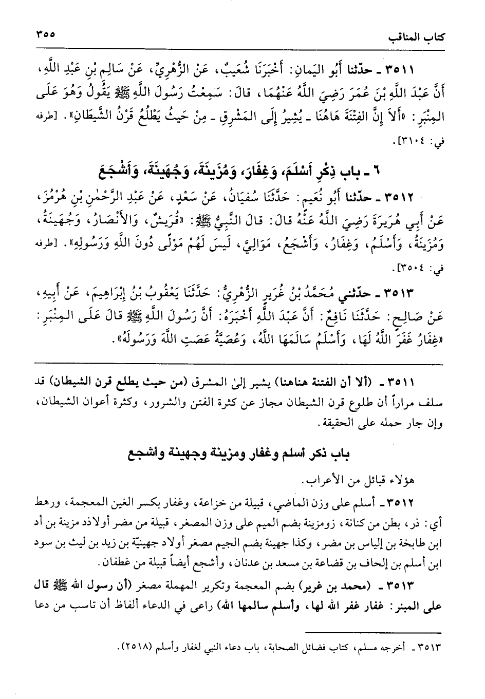 3512 - أسلم على وزن الماضي، قبيلة من خزاعة، وغفار بكسر الغين المعجمة، ورهط أي: ذر، بطن من كنانة، ومزينة بضم الميم على وزن المصغر، قبيلة من مضر أولاد مزينة بن أد بن طابخة بن إلياس بن مضر، وكذا جهينة بضم الجيم مصغر أولاد جهينيّة بن زيد بن ليث بن سود بن أسلم بن إلحاف بن قضاعة بن مسعد بن عدنان، وأشجع أيضًا قبيلة من غطفان.