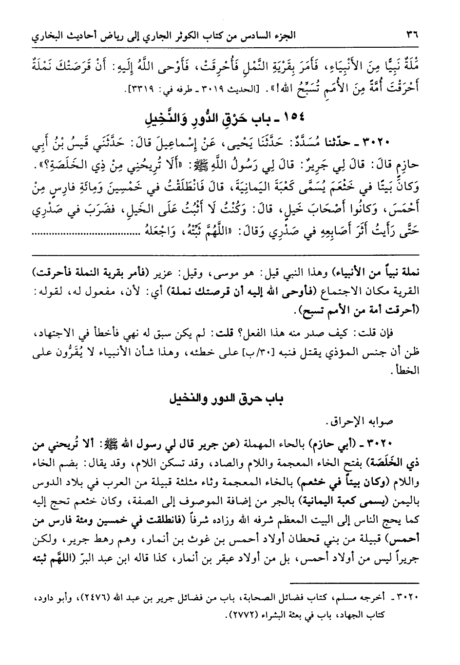 3020 - (أبي حازم) بالحاء المهملة (عن جرير قال لي رسول الله - صلى الله عليه وسلم -: ألا تُريحني من ذي الخَلَصَة) بفتح الخاء المعجمة واللام والصاد، وقد تسكن اللام، وقد يقال: بضم الخاء واللام (وكان بيتًا في خثعم) بالخاء المعجمة وثاء مثلثة قبيلة من العرب في بلاد الدوس باليمن (يسمى كعبة اليمانية) بالجر من إضافة الموصوف إلى الصفة، وكان خثعم تحج إليه كما يحج الناس إلى البيت المعظم شرفه الله وزاده شرفًا (فانطلقت في خمسين ومئة فارس من أحمس) قبيلة من بني قحطان أولاد أحمس بن غوث بن أنمار، وهم وهي جرير، ولكن جريرًا ليس من أولاد أحمس، بل من أولاد عبقر بن أنمار، كذا قاله ابن عبد البرّ (اللهَّم ثبته