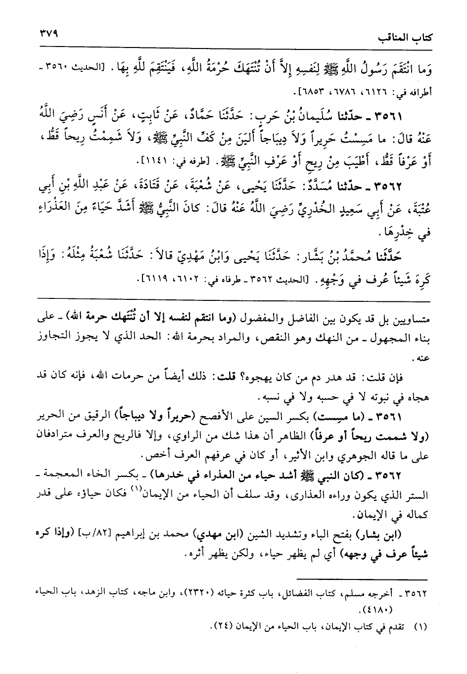 3561 - حَدَّثَنَا سُلَيْمَانُ بْنُ حَرْبٍ حَدَّثَنَا حَمَّادٌ عَنْ ثَابِتٍ عَنْ أَنَسٍ - رضى الله عنه - قَالَ مَا مَسِسْتُ حَرِيرًا وَلاَ دِيبَاجًا أَلْيَنَ مِنْ كَفِّ النَّبِيِّ - صلى الله عليه وسلم -، وَلاَ شَمِمْتُ رِيحًا قَطُّ أَوْ عَرْفًا قَطُّ أَطْيَبَ مِنْ رِيحِ أَوْ عَرْفِ النَّبِيِّ - صلى الله عليه وسلم -. طرفه 1141