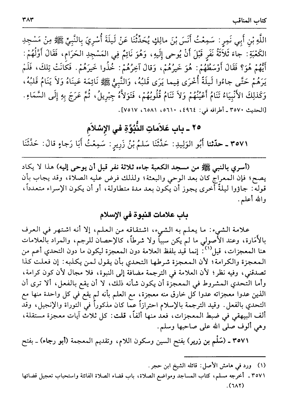 (أسري بالنبي -صلى الله عليه وسلم- من مسجد الكعبة جاءه ثلاثة نفر قبل أن يوحى إليه) هذا لا يكاد يصح؛ فإن المعراج كان بعد الوحي والبعثة؛ ولذلك فرض عليه الصلاة، وقد يجاب بأن قوله: جاؤوا ليلةً أخرى يجوز أن يكون بعد مدة متطاولة، أو أن يكون الإسراء متعددًا، والله أعلم.