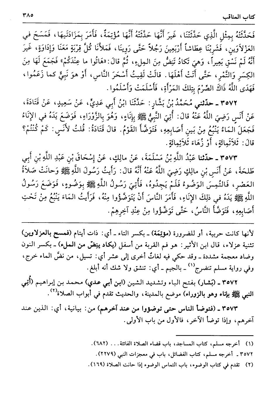3572 - حَدَّثَنِى مُحَمَّدُ بْنُ بَشَّارٍ حَدَّثَنَا ابْنُ أَبِى عَدِىٍّ عَنْ سَعِيدٍ عَنْ قَتَادَةَ عَنْ أَنَسٍ - رضى الله عنه - قَالَ أُتِىَ النَّبِىُّ - صلى الله عليه وسلم - بِإِنَاءٍ وَهْوَ بِالزَّوْرَاءِ، فَوَضَعَ يَدَهُ فِي الإِنَاءِ، فَجَعَلَ الْمَاءُ يَنْبُعُ مِنْ بَيْنِ أَصَابِعِهِ، فَتَوَضَّأَ الْقَوْمُ. قَالَ قَتَادَةُ قُلْتُ لأَنَسٍ كَمْ كُنْتُمْ قَالَ ثَلاَثَمِائَةٍ، أَوْ زُهَاءَ ثَلاَثِمِائَةٍ.