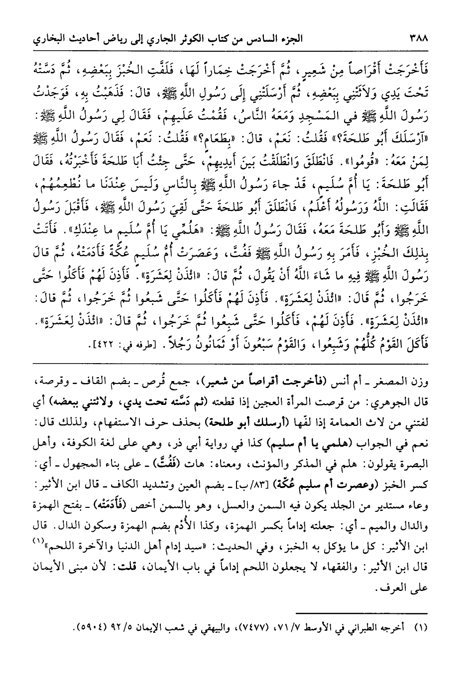 وزن المصغر- أم أنس (فأخرجت أقراصًا من شعير)، جمع قُرص -بضم القاف- وقرصة، قال الجوهري: من قرصت المرأة العجين إذا قطعته (ثم دَسَّته تحت يدي، ولاثتني ببعضه) أي لفتني من لاث العمامة إذا لفّها (أرسلك أبو طلحة) بحذف حرف الاستفهام، ولذلك قال: نعم في الجواب (هلمي يا أم سليم) كذا في رواية أبي ذر، وهي على لغة الكوفة، وأهل البصرة يقولون: هلم في المذكر والمؤنث، ومعناه: هات (فَفُتَّ) -على بناء المجهول- أي: كسر الخبز (وعصرت أم سليم عُكّة) -بضم العين وتشديد الكاف- قال ابن الأثير: وعاء مستدير من الجلد يكون فيه السمن والعسل، وهو بالسمن أخص (فَأَدَمَتْه) -بفتح الهمزة والدال والميم- أي: جعلته إدامًا بكسر الهمزة، وكذا الأُدْم بضم الهمزة وسكون الدال. قال ابن الأثير: كل ما يؤكل به الخبز، وفي الحديث: "سيد إدام أهل الدنيا والآخرة اللحم" قال ابن الأثير: والفقهاء لا يجعلون اللحم إدامًا في باب الأيمان، قلت: لأن مبنى الأيمان على العرف.