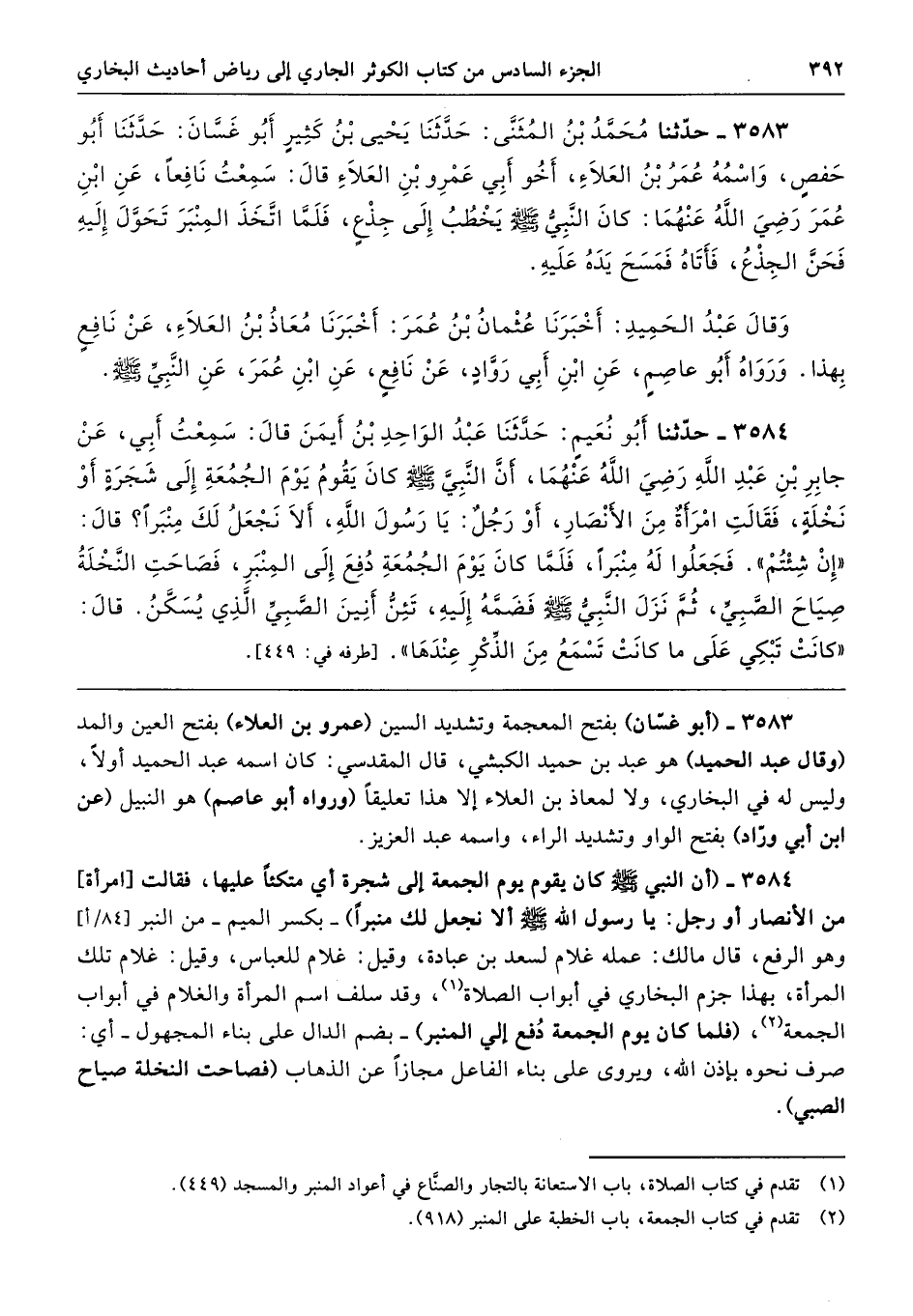 3584 - (أن النبي -صلى الله عليه وسلم- كان يقوم يوم الجمعة إلى شجرة أي متكئًا عليها، فقالت [امرأة] من الأنصار أو رجل: يا رسول الله -صلى الله عليه وسلم- ألا نجعل لك منبرًا) -بكسر الميم- من النبر وهو الرفع، قال مالك: عمله غلام لسعد بن عبادة، وقيل: غلام للعباس، وقيل: غلام تلك المرأة، بهذا جزم البخاري في أبواب الصلاة، وقد سلف اسم المرأة والغلام في أبواب الجمعة، (فلما كان يوم الجمعة دُفع إلي المنبر) -بضم الدال على بناء المجهول- أي: صرف نحوه بإذن الله، ويروى على بناء الفاعل مجازًا عن الذهاب (فصاحت النخلة صياح الصبي).
