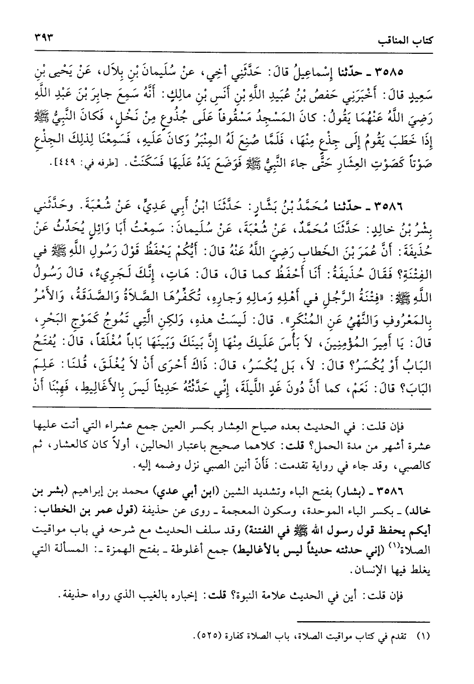 3586 - حَدَّثَنَا مُحَمَّدُ بْنُ بَشَّارٍ حَدَّثَنَا ابْنُ أَبِى عَدِىٍّ عَنْ شُعْبَةَ. حَدَّثَنِى بِشْرُ بْنُ خَالِدٍ حَدَّثَنَا مُحَمَّدٌ عَنْ شُعْبَةَ عَنْ سُلَيْمَانَ سَمِعْتُ أَبَا وَائِلٍ يُحَدِّثُ عَنْ حُذَيْفَةَ أَنَّ عُمَرَ بْنَ الْخَطَّابِ - رضى الله عنه - قَالَ أَيُّكُمْ يَحْفَظُ قَوْلَ رَسُولِ اللَّهِ - صلى الله عليه وسلم - فِي الْفِتْنَةِ فَقَالَ حُذَيْفَةُ أَنَا أَحْفَظُ كَمَا قَالَ. قَالَ هَاتِ إِنَّكَ لَجَرِئٌ. قَالَ رَسُولُ اللَّهِ - صلى الله عليه وسلم - «فِتْنَةُ الرَّجُلِ فِي أَهْلِهِ وَمَالِهِ وَجَارِهِ تُكَفِّرُهَا الصَّلاَةُ وَالصَّدَقَةُ وَالأَمْرُ بِالْمَعْرُوفِ وَالنَّهْىُ عَنِ الْمُنْكَرِ». قَالَ لَيْسَتْ هَذِهِ، وَلَكِنِ الَّتِى تَمُوجُ كَمَوْجِ الْبَحْرِ. قَالَ يَا أَمِيرَ الْمُؤْمِنِينَ لاَ بَأْسَ عَلَيْكَ مِنْهَا، إِنَّ بَيْنَكَ وَبَيْنَهَا بَابًا مُغْلَقًا. قَالَ يُفْتَحُ الْبَابُ أَوْ يُكْسَرُ قَالَ لاَ بَلْ يُكْسَرُ. قَالَ ذَاكَ أَحْرَى أَنْ لاَ يُغْلَقَ. قُلْنَا عَلِمَ الْبَابَ قَالَ نَعَمْ، كَمَا أَنَّ دُونَ غَدٍ اللَّيْلَةَ، إِنِّى حَدَّثْتُهُ حَدِيثًا لَيْسَ بِالأَغَالِيطِ. فَهِبْنَا أَنْ
