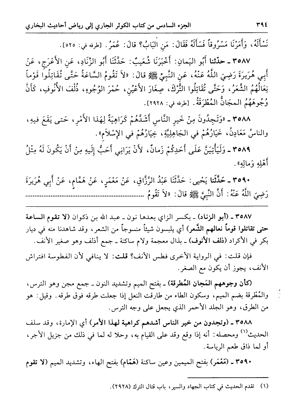 3587 - (أبو الزناد) -بكسر الزاي بعدها نون- عبد الله بن ذكوان (لا تقوم الساعة حتى تقاتلوا قومًا نعالهم الشَّعر) أي يلبسون شيئًا منسوجًا من الشعر، وقد شاهدنا منه في ديار بكر في الأكراد (ذلف الأنوف) -بذال معجمة ولام ساكنة- جمع أذلف وهو صغير الأنف.