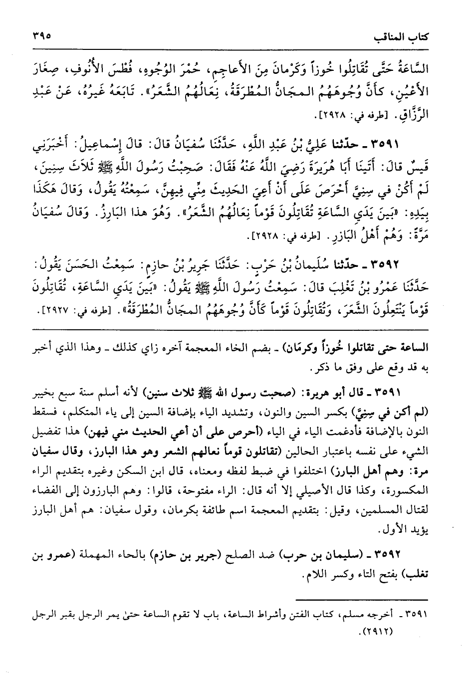 3591 - قال أبو هريرة: (صحبت رسول الله -صلى الله عليه وسلم- ثلاث سنين) لأنه أسلم سنة سبع بخيبر (لم أكن في سِنِيَّ) بكسر السين والنون، وتشديد الياء بإضافة السين إلى ياء المتكلم، فسقط النون بالإضافة فأدغمت الياء في الياء (أحرص على أن أعي الحديث مني فيهن) هذا تفضيل الشيء على نفسه باعتبار الحالين (تقاتلون قومًا نعالهم الشعر وهو هذا البارز، وقال سفيان مرة: وهم أهل البارز) اختلفوا في ضبط لفظه ومعناه، قال ابن السكن وغيره بتقديم الراء المكسورة، وكذا قال الأصيلي إلا أنه قال: الراء مفتوحة، قالوا: وهم البارزون إلى الفضاء لقتال المسلمين، وقيل: بتقديم المعجمة اسم طائفة بكرمان، وقول سفيان: هم أهل البارز يؤيد الأول.