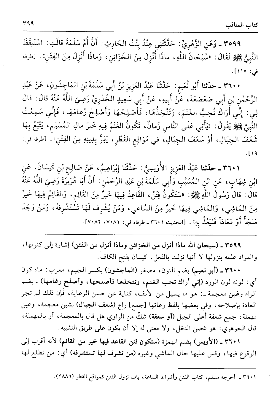 3601 - حَدَّثَنَا عَبْدُ الْعَزِيزِ الأُوَيْسِىُّ حَدَّثَنَا إِبْرَاهِيمُ عَنْ صَالِحِ بْنِ كَيْسَانَ عَنِ ابْنِ شِهَابٍ عَنِ ابْنِ الْمُسَيَّبِ وَأَبِى سَلَمَةَ بْنِ عَبْدِ الرَّحْمَنِ أَنَّ أَبَا هُرَيْرَةَ - رضى الله عنه - قَالَ قَالَ رَسُولُ اللَّهِ - صلى الله عليه وسلم - «سَتَكُونُ فِتَنٌ، الْقَاعِدُ فِيهَا خَيْرٌ مِنَ الْقَائِمِ، وَالْقَائِمُ فِيهَا خَيْرٌ مِنَ الْمَاشِى، وَالْمَاشِى فِيهَا خَيْرٌ مِنَ السَّاعِى، وَمَنْ يُشْرِفْ لَهَا تَسْتَشْرِفْهُ، وَمَنْ وَجَدَ مَلْجَأً أَوْ مَعَاذًا فَلْيَعُذْ بِهِ». طرفاه 7081، 7082