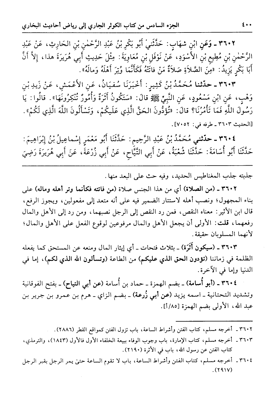 3603 - (سيكون أَثَرَة) -بثلاث فتحات- أي إيثار المال ومنعه عن المستحق كما يفعله الظلمة في زماننا (تؤدون الحق الذي عليكم) من الطاعة (وتسألون الله الذي لكم)، إما في الدنيا وإما في الآخرة.