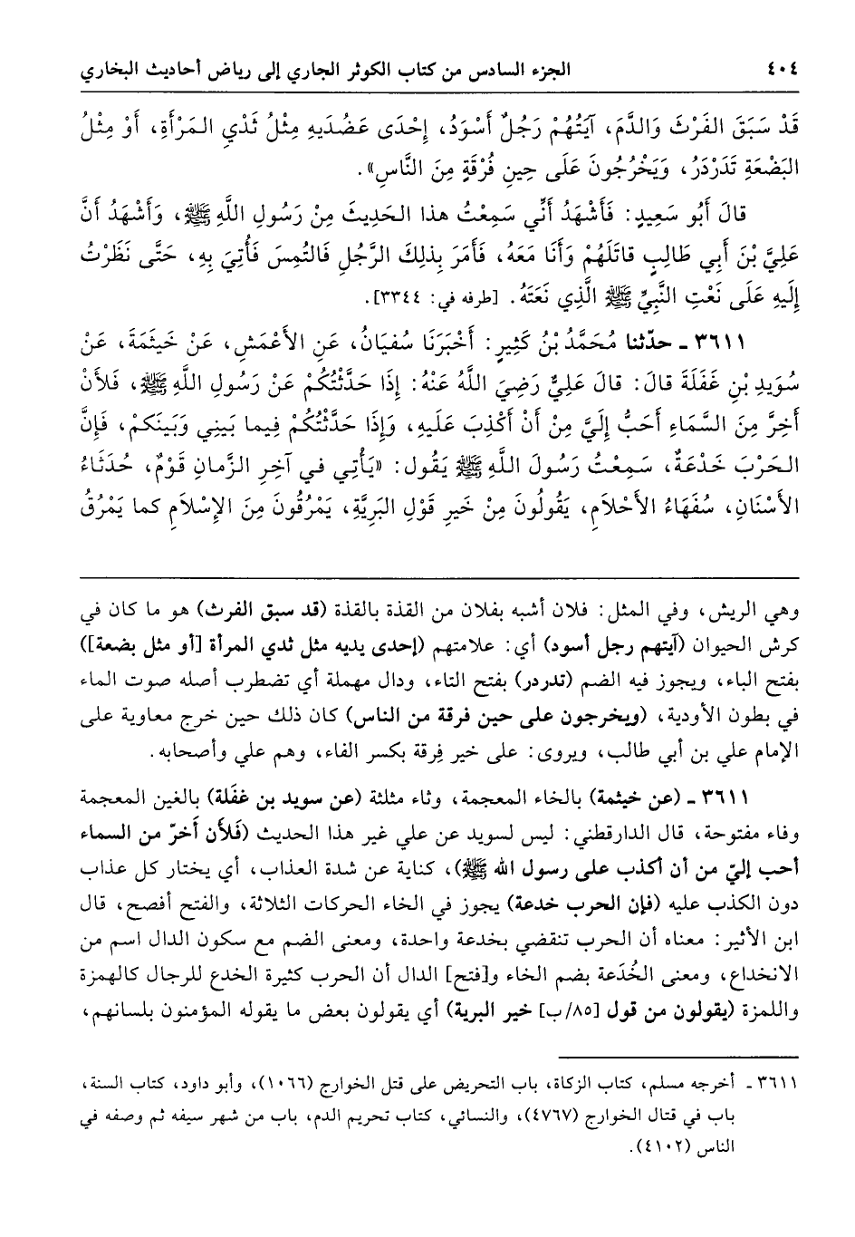 وهي الريش، وفي المثل: فلان أشبه بفلان من القذة بالقذة (قد سبق الفرث) هو ما كان في كرش الحيوان (آيتهم رجل أسود) أي: علامتهم (إحدى يديه مثل ثدي المرأة [أو مثل بضعة]) بفتح الباء، ويجوز فيه الضم (تدردر) بفتح التاء، ودال مهملة أي تضطرب أصله صوت الماء في بطون الأودية، (ويخرجون على حين فرقة من الناس) كان ذلك حين خرج معاوية على الإمام علي بن أبي طالب، ويروى: على خير فِرقة بكسر الفاء، وهم علي وأصحابه.